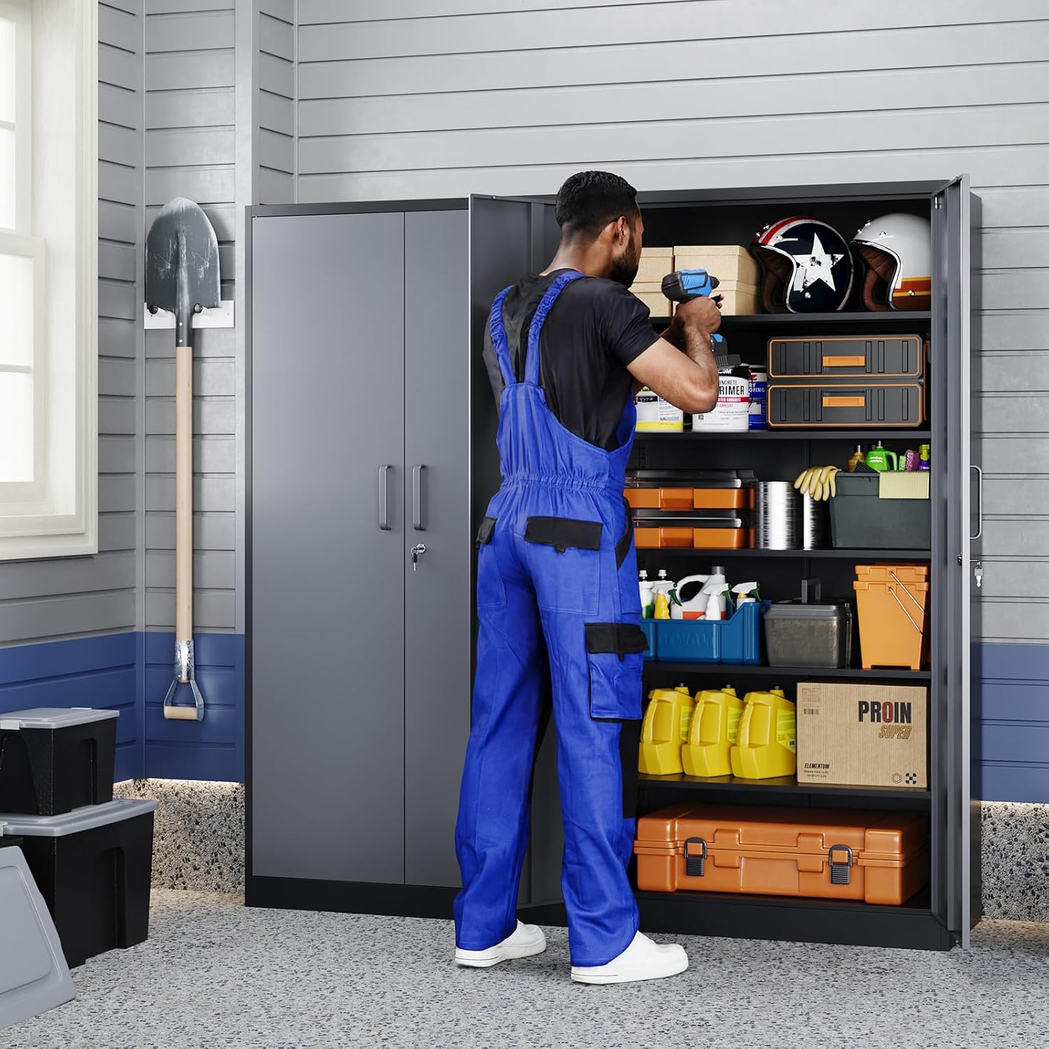 • 『EASY ASSEMBLING』: 70.87 inch×31.5 inch×15.7 inch (H x W x D). 2 wing doors with a 180°opening angle. The garage storage cabinet is knock-down structure, when you receive it, you need to assemble. The package comes with detailed assembly instructions, easy to assemble.