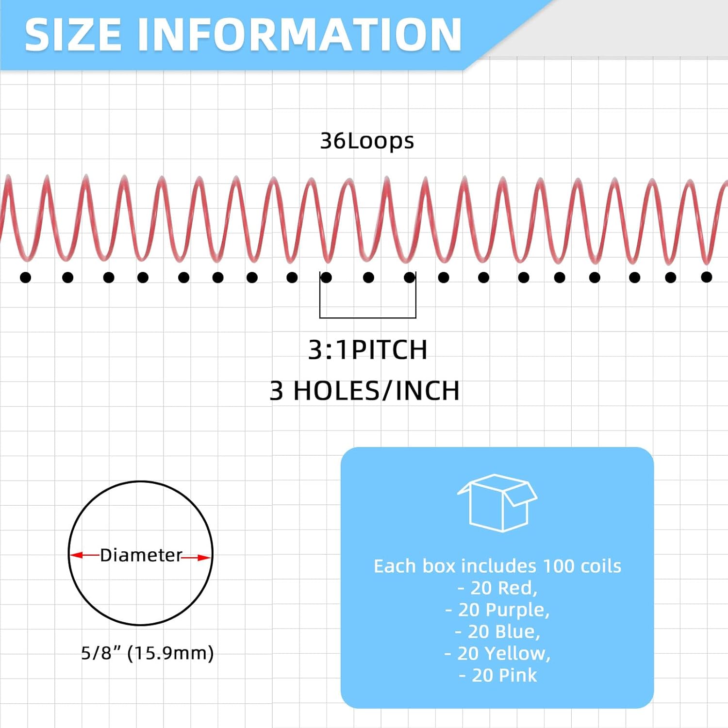 • 【Cost-Effective Pack of 100】Available in multiple colors (Yellow, Blue, Red, Purple, Pink), these coils provide a budget-friendly solution for binding projects at the office, school, or home