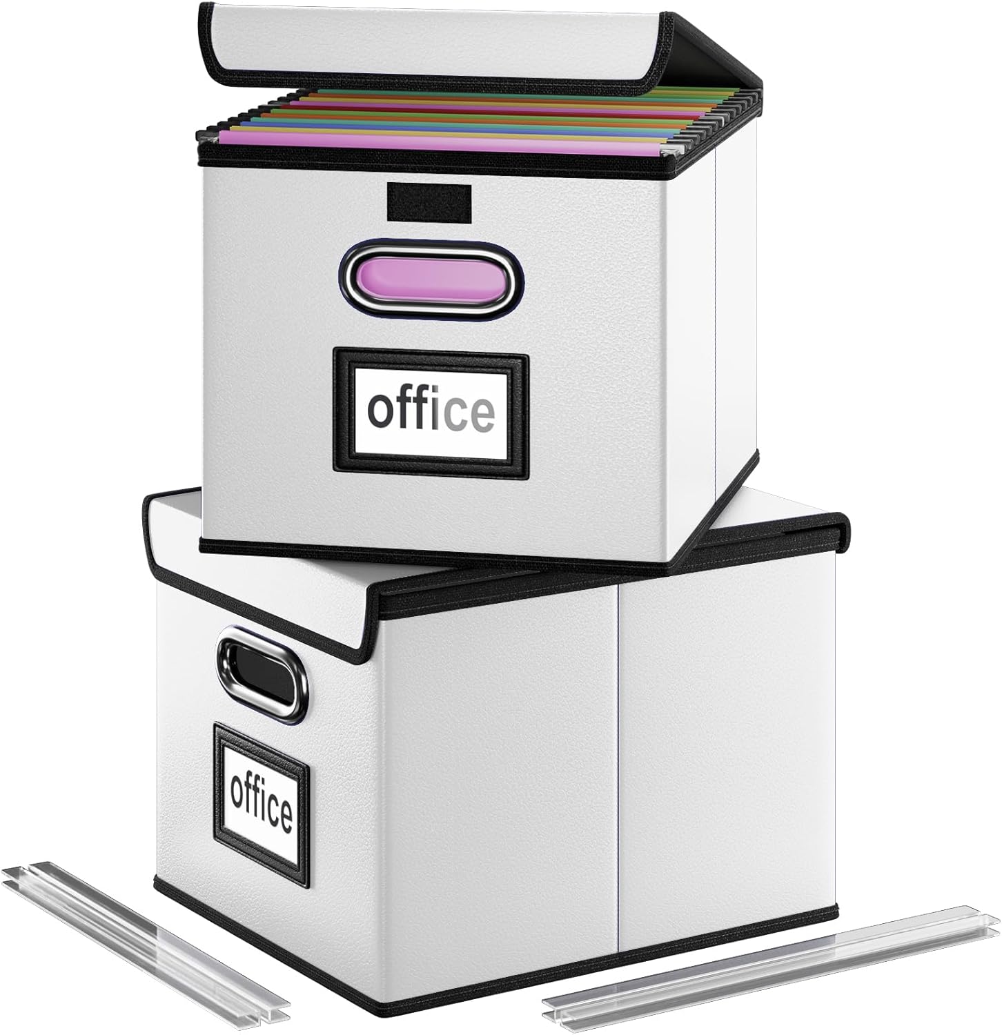 • Unique Functional Design - This file organizer both sides are equipped with practical PVP slide rails, which can not only prevent the two sides of the storage box from loosening, but also facilitate the sliding of the file folder, which is very suitable for hanging file folders. The metal handles on both sides allow us to easily move the storage boxes, and the label slot on one side facilitates classification. Functional features and a beautiful design create the best filing box organizer.