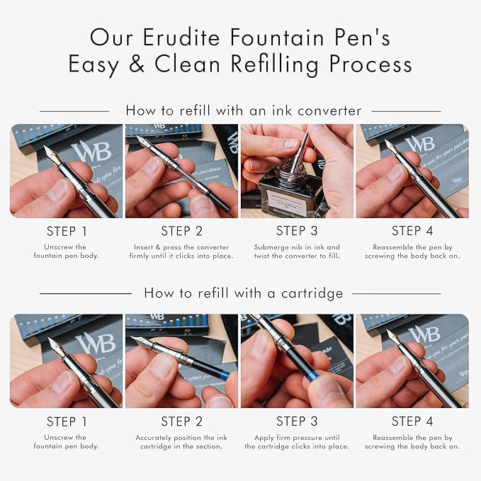 • ✒️Discover The All-inclusive Refillable Fountain Pen Set - Includes luxurious fountain pen, ink converter, 24 Pack Ink Cartridges, and a Gift Pouch - ready to be gifted. Each calligraphy ink and fountain pen ink cartridges comes in a plastic re-closable case and will last you at least 2 weeks of regular use. With every order is a complete instruction booklet for your Wordsworth and Black Pen Set. All the information you'll need to get started using and enjoying your luxurious writing tool!