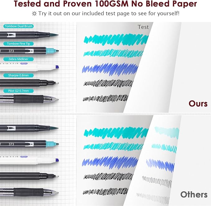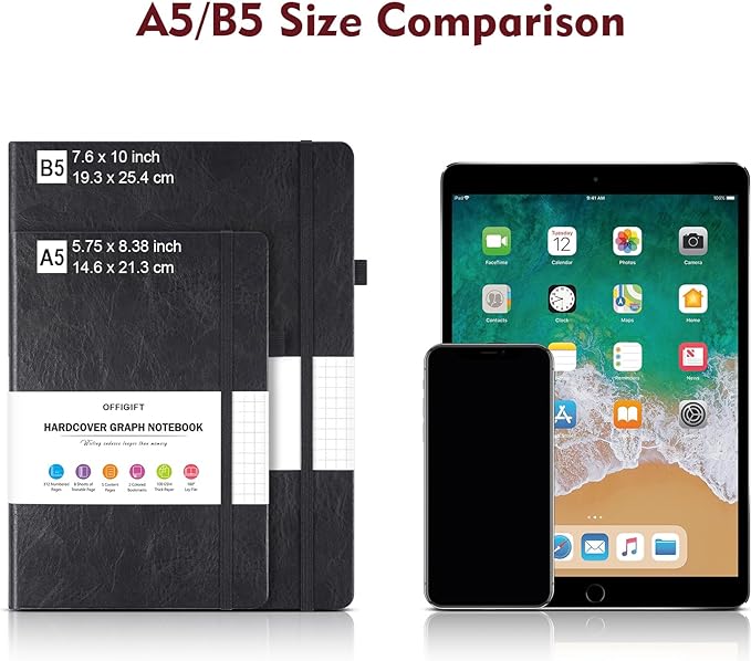 • 【Thick Paper for Writing Without Limits】Large B5 hardcover notebook (7.6"x 10"/193mm x 264mm), total 320 pages, includes 312 numbered pages(equal to 156 sheets). 5 x 5mm graph grid paper(5 squares per inch). Our INNOVATIVE PAPER TECHNOLOGY on 100GSM thick paper ensures a perfect canvas for your ideas - no bleed, no ghosting, as confirmed by tests with various pens.