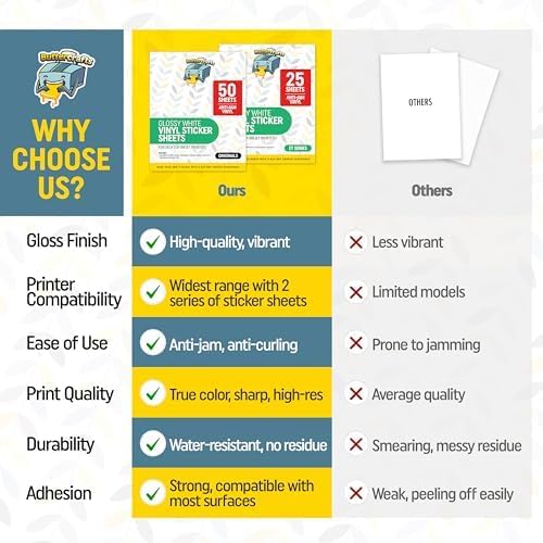 • HIGHER SUCCESS RATE, LESS FRUSTRATIONS - Two types of printable vinyl sticker printer papers for maximum coverage of printers - This version is recommended for HP, Canon, Brother & other brands. Select the other option for Epson Printers