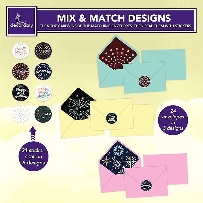 • MATCHING ENVELOPES & STICKERS - Mix and match the boxed work anniversary cards. Get 24 workaversary cards for work in 8 designs, 24 envelopes with pre-water soluble gum closure in 3 designs and printed inner lining, and 24 sticker seals in 8 designs.