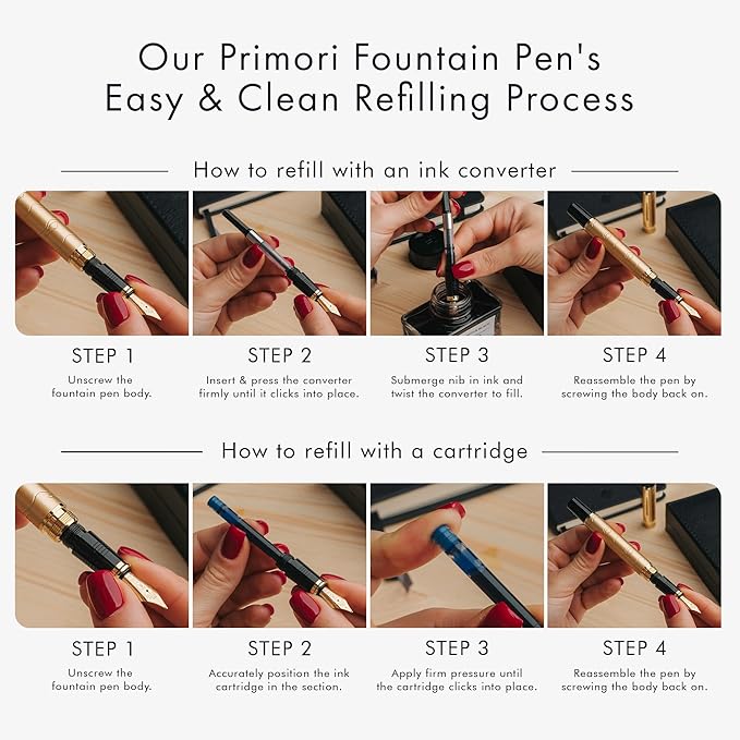• ✒️Express Yourself Through Effortless Writing - Built to offer a delicate weight that is perfect for both left and right handed writers, this Primori fountain pen set will be your best writing tool that you carry around and bring with you everywhere. With the smooth lines, consistent flow, your lines will always glide across the page whether it is notes in your agenda or doodles on the side of a page. With zero ink leakage and cap cover, this is the perfect writer's pen.