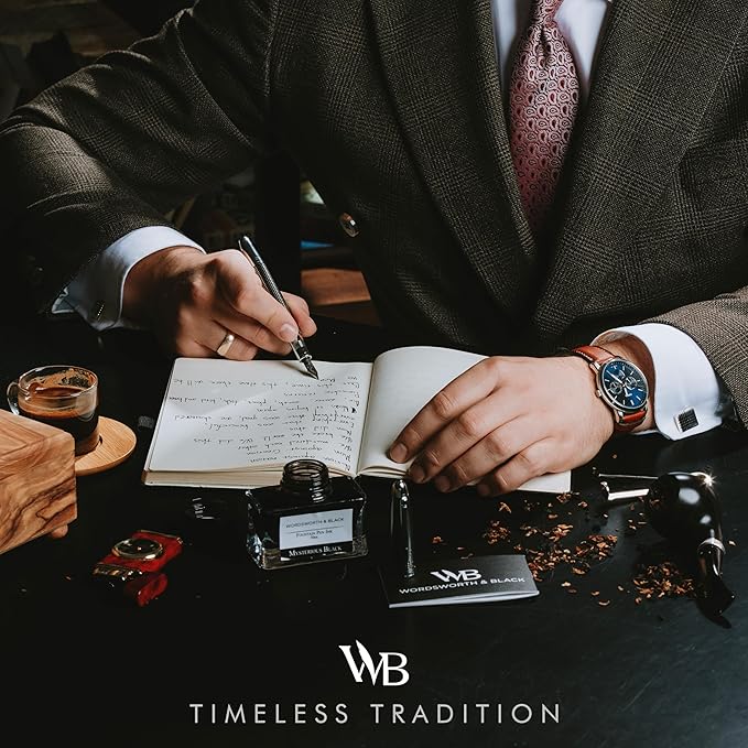 • ✒️Discover The All-inclusive Refillable Fountain Pen Set - Includes luxurious Majesti fountain pen, ink converter, 12 x blue ink cartridges, 12 x black ink cartridges, premium leather pen case, and a deluxe gift box - ready to be gifted. Included with every order is a complete instruction booklet for your Wordsworth and Black Pen Set. All the information you'll need to get started using and enjoying your luxurious writing tool will be right at your fingertips!