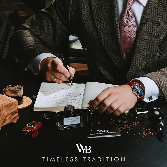 • ✒️Discover The All-inclusive Refillable Fountain Pen Set - Includes luxurious Majesti fountain pen, ink converter, 12 x blue ink cartridges, 12 x black ink cartridges, premium leather pen case, and a deluxe gift box - ready to be gifted. Included with every order is a complete instruction booklet for your Wordsworth and Black Pen Set. All the information you'll need to get started using and enjoying your luxurious writing tool will be right at your fingertips!