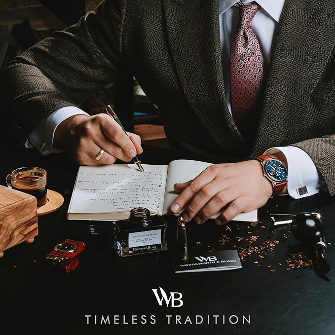 • ✒️Discover The All-inclusive Refillable Fountain Pen Set - Includes luxurious Majesti fountain pen, ink converter, 12 x blue ink cartridges, 12 x black ink cartridges, premium leather pen case, and a deluxe gift box - ready to be gifted. Included with every order is a complete instruction booklet for your Wordsworth and Black Pen Set. All the information you'll need to get started using and enjoying your luxurious writing tool will be right at your fingertips!