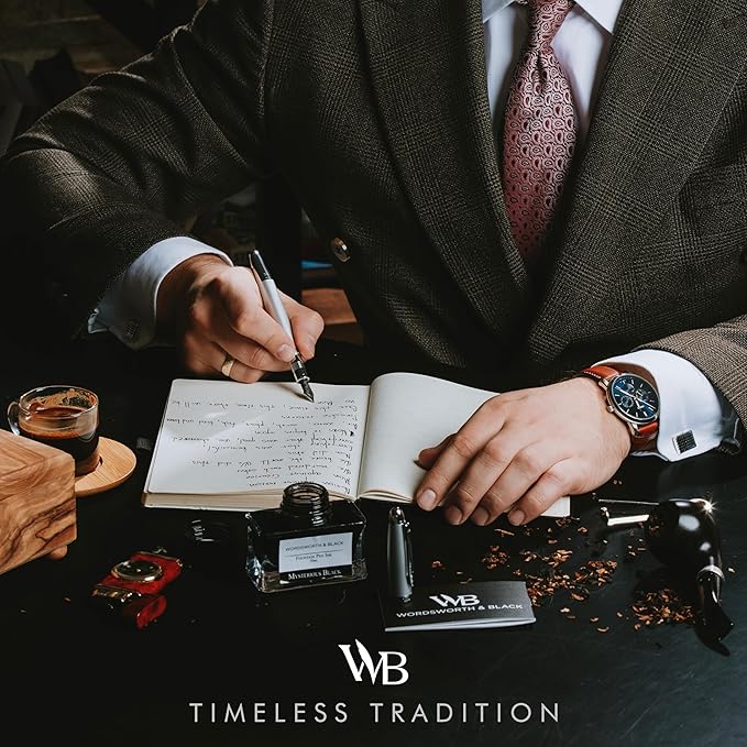 • ✒️Discover The All-inclusive Refillable Fountain Pen Set - Includes luxurious Majesti fountain pen, ink converter, 12 x blue ink cartridges, 12 x black ink cartridges, premium leather pen case, and a deluxe gift box - ready to be gifted. Included with every order is a complete instruction booklet for your Wordsworth and Black Pen Set. All the information you'll need to get started using and enjoying your luxurious writing tool will be right at your fingertips!