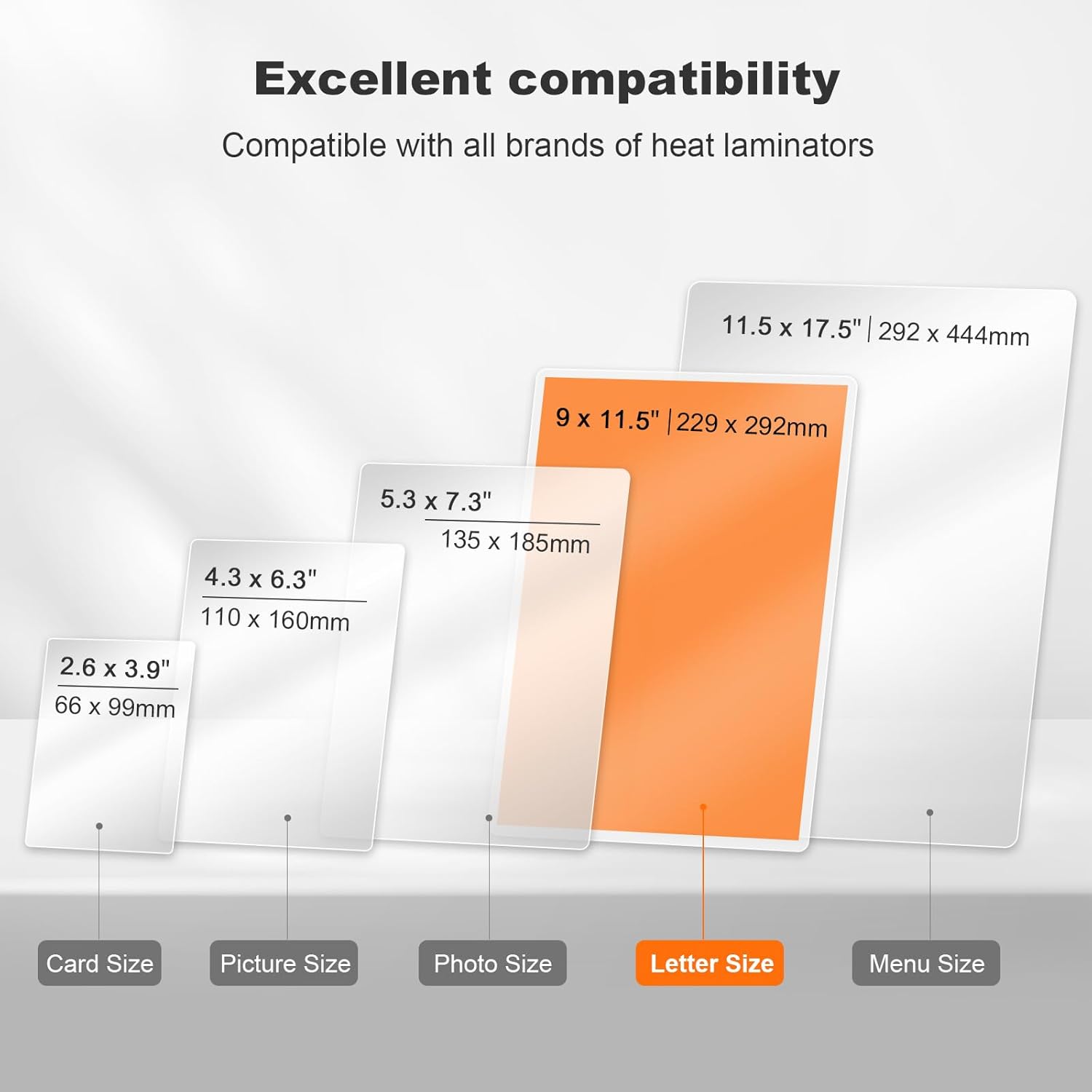 • [Compatibility] The Laminating Pouches measures 9 x 11.5 inches, letter size, you can cut it to any size you want and it is compatible with all thermal laminator brands.