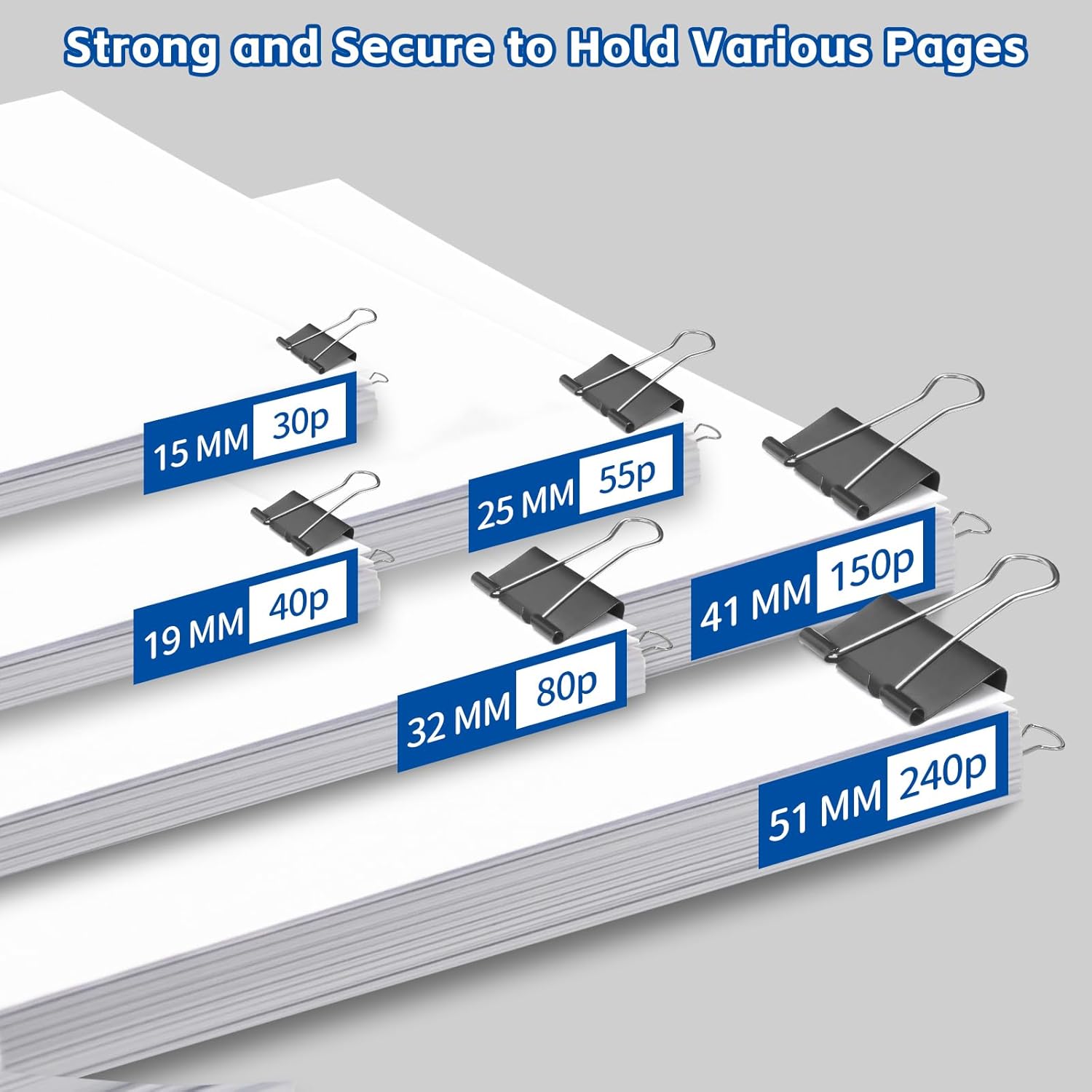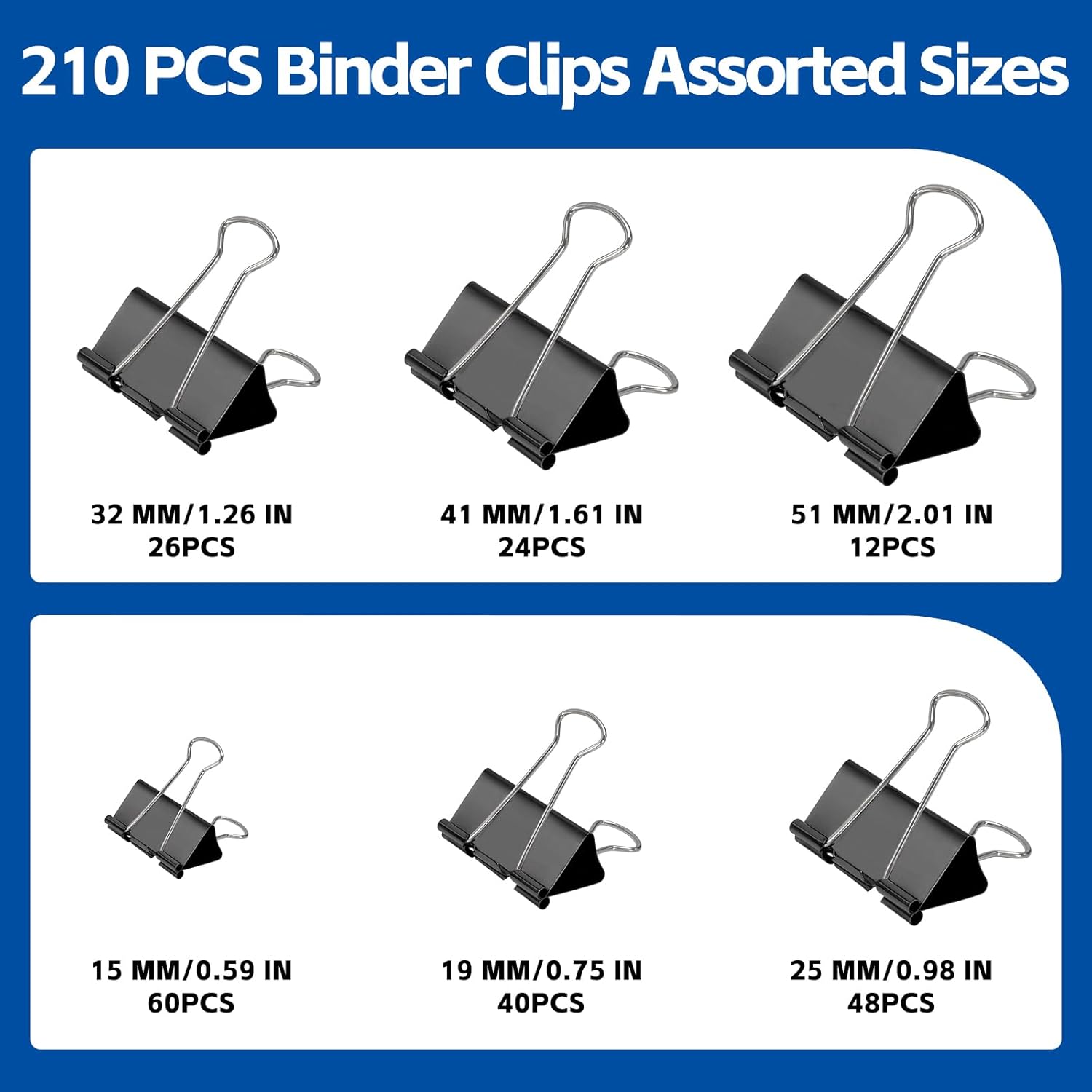 • Binder Clips Size - 2 inch x 12 pcs, 1.6 inch x 24 pcs, 1.26 inch x 26 pcs, 0.98 inch x 48 pcs, 0.75 inch x 40 pcs, 0.6 inch x 60 pcs, assorted size total 210 pcs binder clips kit can meet your different using needs.