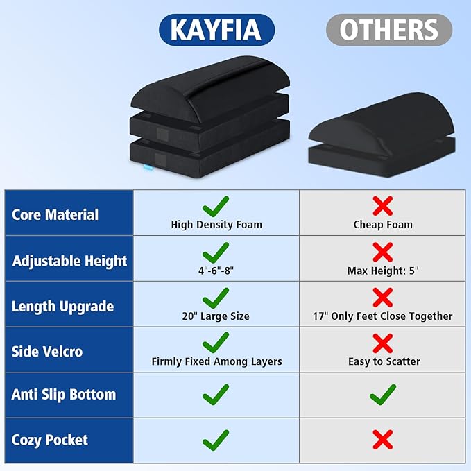 • [3 Adjustable Height] KAYFIA foot rest measures 20 "x11.8" x8 "with 3 adjustable height options from 4", 6 "to 8", which has velcro stickers on the lower and side for adjusting the height as needed. The upgraded length provides maximum freedom of movement for the legs to meet multiple usage postures.