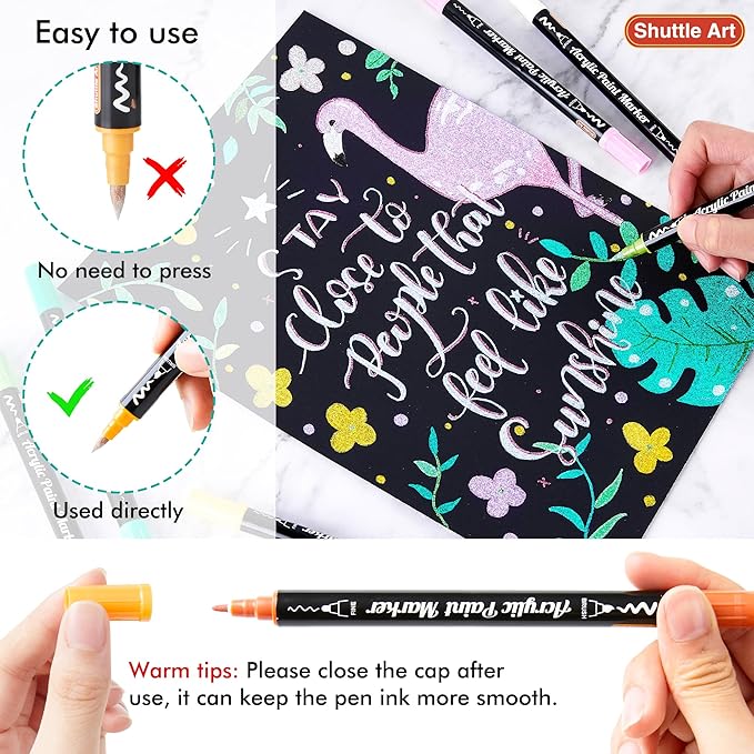 • 【UNIQUE DUAL TIP DESIGN】: Each acrylic paint marker come with a 1-5mm flexible fiber brush tip and 1mm fine tip, allows you to create medium or bold strokes by changing brush pressure and experience fine strokes with fine tip. Our tips are made of special fiber material which is wear-resistant, no branching and durable for a really long time.