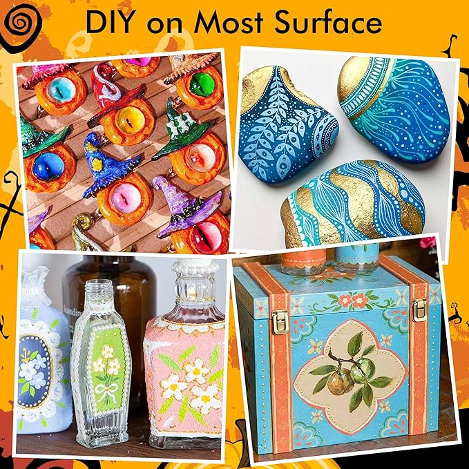 • 【MULTI-PURPOSE】: Enjoy creating art projects on a variety of surfaces, acrylic paint marker set suitable for rock painting, ceramic and mug painting, glass and wine glass painting, wood, fabric, stone, metal, plastic, canvas, Christmas ornament, Halloween pumpkin painting, calligraphy, scrapbook, bullet journal, brush lettering, custom mugs, DIY crafts projects, and much more for both smooth and porous surfaces.