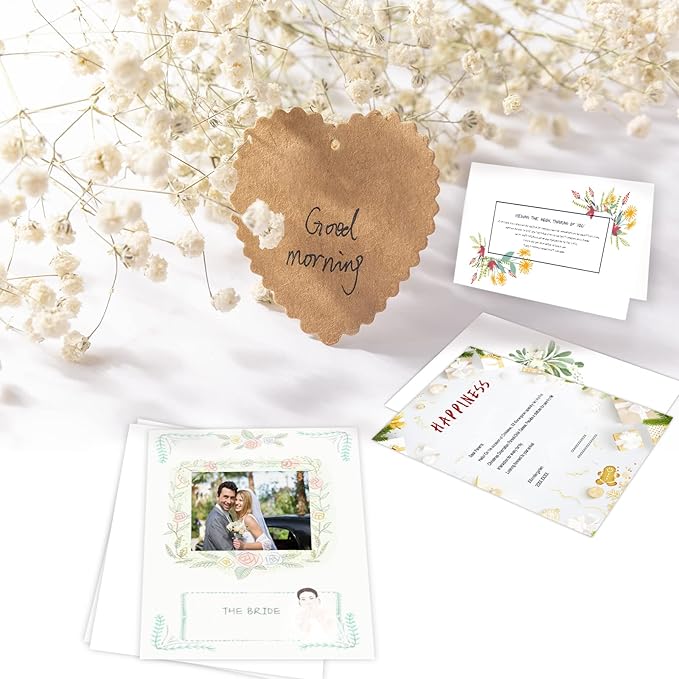 • Elite Design: Both side of these thank you cards have texture ; They are matte, but have a smooth finish ; These are flat cards with no score to be folded ; Securely packaged in a box to ensure you get your heavy card stock in perfect condition and for your convenience to store your invitation paper