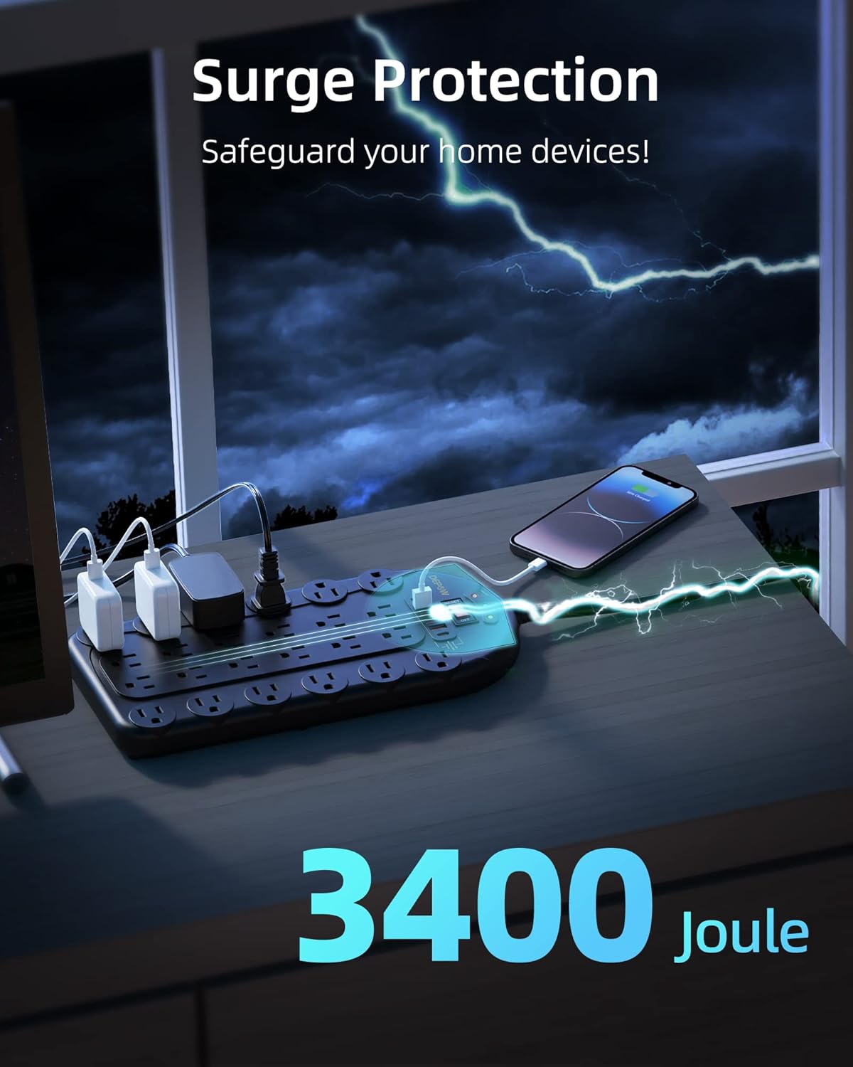 • 【Safeguard Your Devices】-This long outlet power strip has a 3400-Joule energy rating providing a reliable surge protector to protect any meeting room, office, personal workstation, or urround sound system.