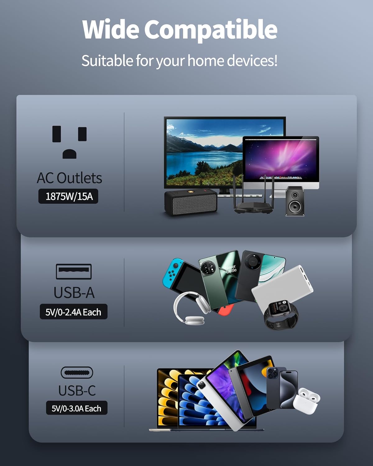 • 【Smart USB Charging】-With built-in USB slots, you don’t have to use a plug for a USB charger. And each port delivers optimized charging to smartphones, game consoles, earphones, power banks, and more (Max 5.2A/26W Shared).