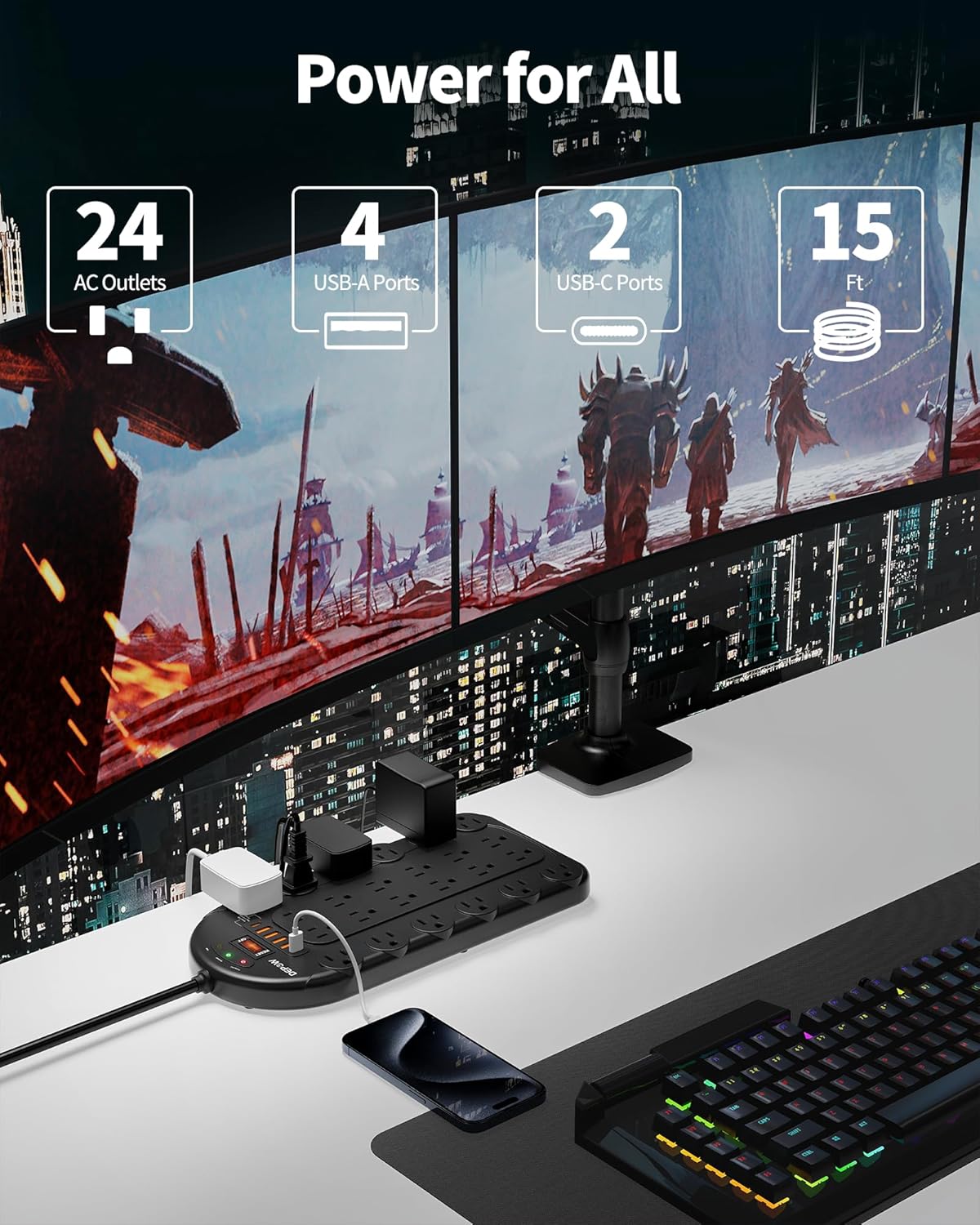 • 【Power for All】-Features 24 grounded outlets, 4 USB-A ports, and 2 USB-C ports to allow you to power up your gaming or media setup, computer, laptop, phone, and camera at the same time. One charging station for a clutter-free desk.