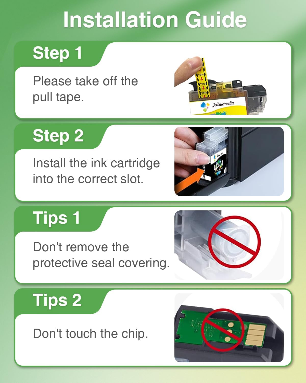 • 【Warm Tips】1. Ignore the printer ink level "?" reminder, it will not affect the use of the cartridge. 2. If your printer shows a message as "Non-Brother Ink", please click "OK", "Yes", "Continue", or just ignore it. This will not affect the cartridge's functionality.