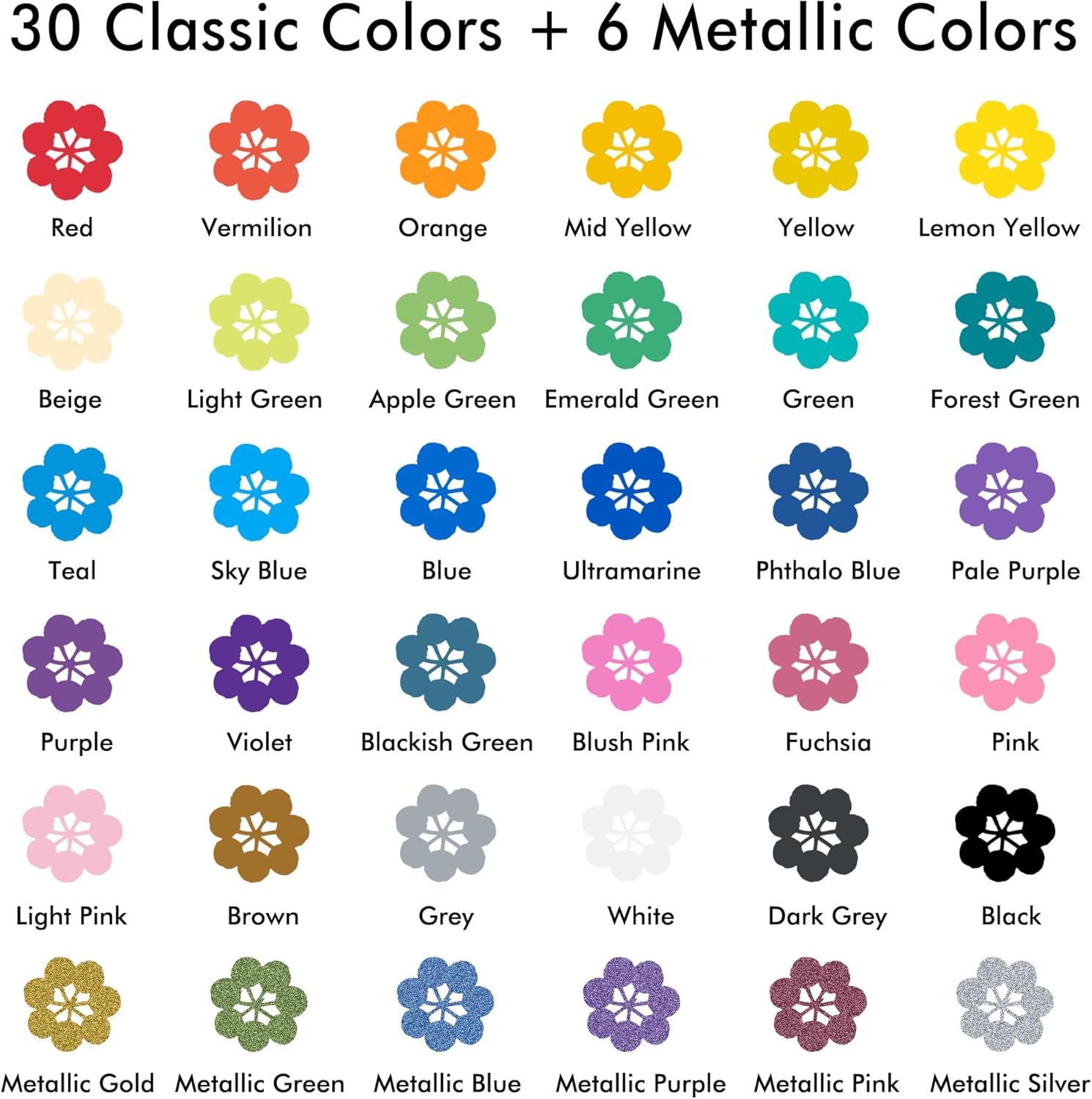 • 【36 UNIQUE AND VIBRANT COLORS】: Shuttle Art 36 acrylic paint markers set contains 30 vibrant colors and 6 cool metallic colors: metallic gold, metallic silver, metallic blue, metallic green,metallic pink,metallic purple.With so much colors, you can almost complete all of your daily creations.