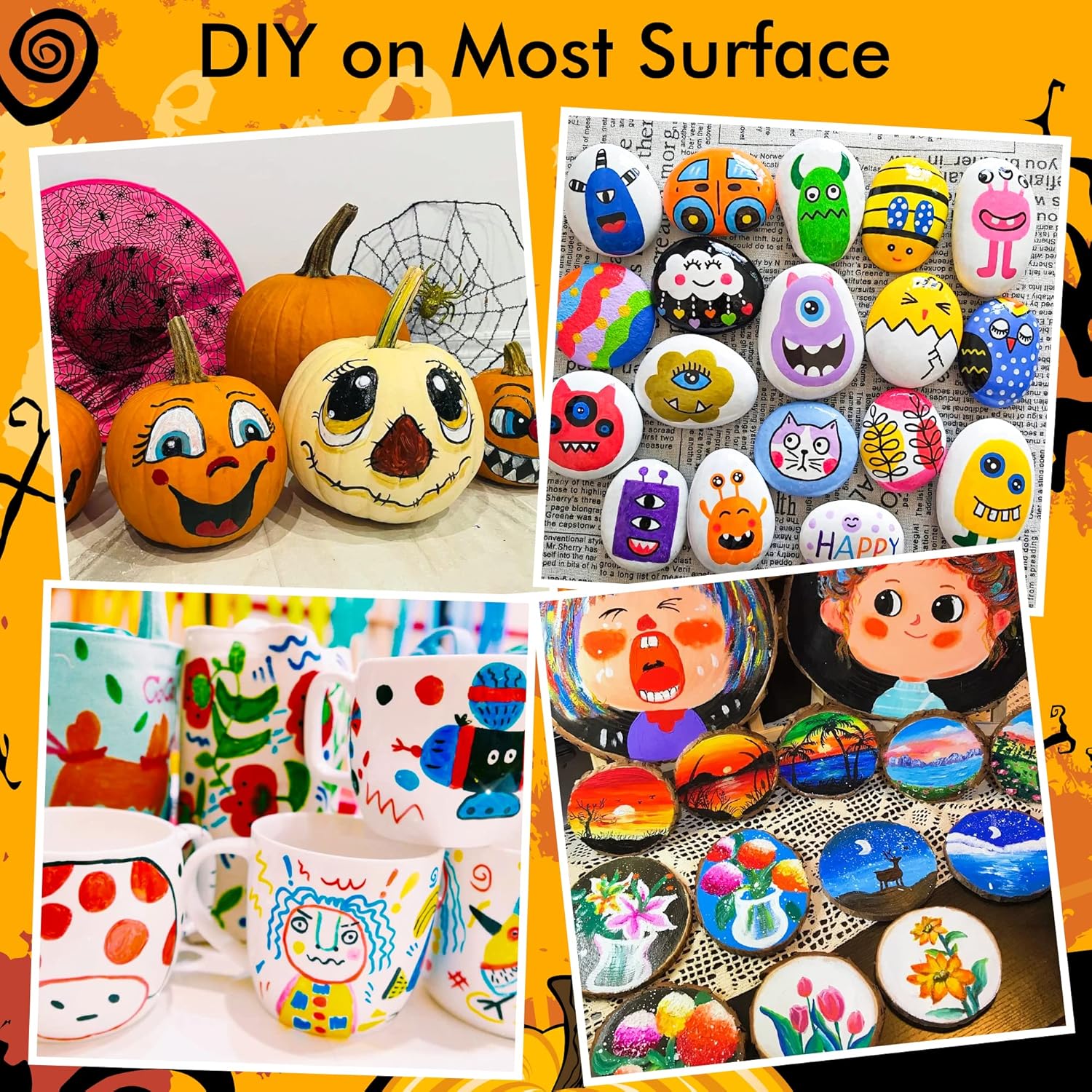 • 【MULTI-PURPOSE】: Enjoy creating art projects on a variety of surfaces, acrylic paint marker set suitable for rock painting, ceramic and mug painting, glass and wine glass painting, wood, fabric, stone, metal, plastic, canvas, Christmas ornament, Halloween pumpkin painting, calligraphy, scrapbook, bullet journal, brush lettering, custom mugs, DIY crafts projects, and much more for both smooth and porous surfaces.