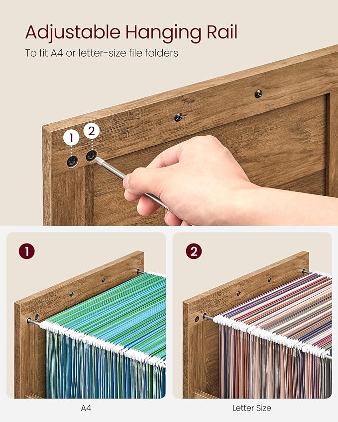 • [Storage Aplenty] Keep your workspace organized with this roomy filing cabinet. The top 2 drawers are perfect for stowing away office supplies, while the bottom file drawer with an adjustable hanging rail gives your A4 or letter-size file folders a home