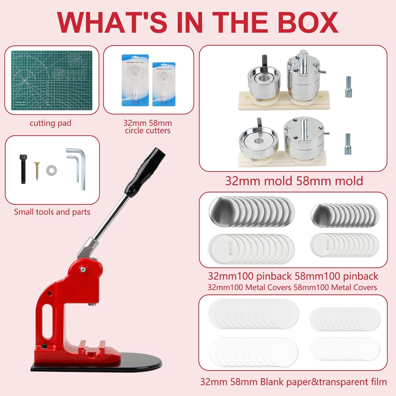 • 【MULTI SIZE CREATIVITY UNLIMITED】 Enjoy the fun of button making with one purchase! The metal button maker machine set is carefully built, including a sturdy and durable metal body, two kinds of button-model, 32mm and 58mm, 100 sets of 32mm button parts and 100 sets of 58mm button parts. Not only that, it also comes with two round cutters and a cutting board to provide you with full production support