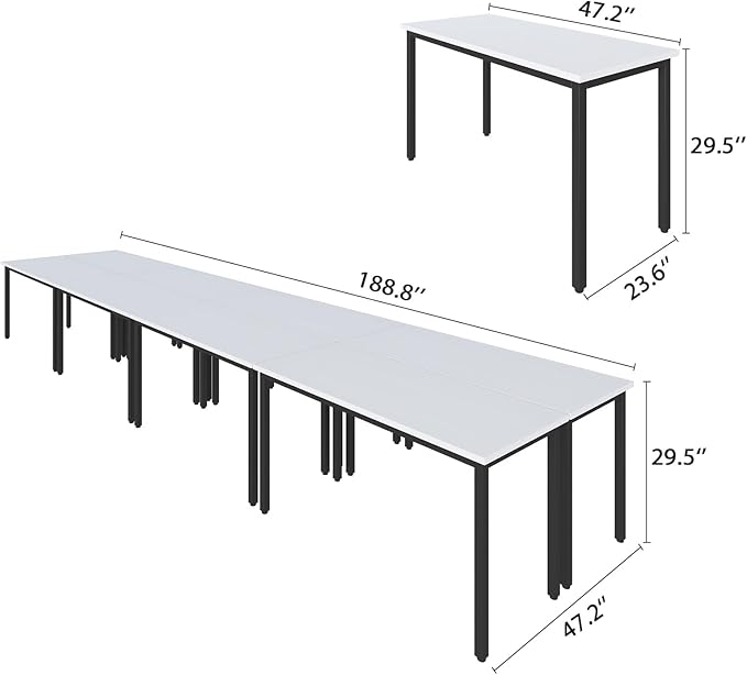 • PERFECT SIZE: 8PCS conference tables accommodate 20 people. Measuring 188.8"D x 47.2"W x 29.5"H. Dimension of each single computer desk is 47.2" L x 23.6" W x 29.5" H for random combination. Stylish and Sleek design ideal for any office, conference room, meeting room and study room.
