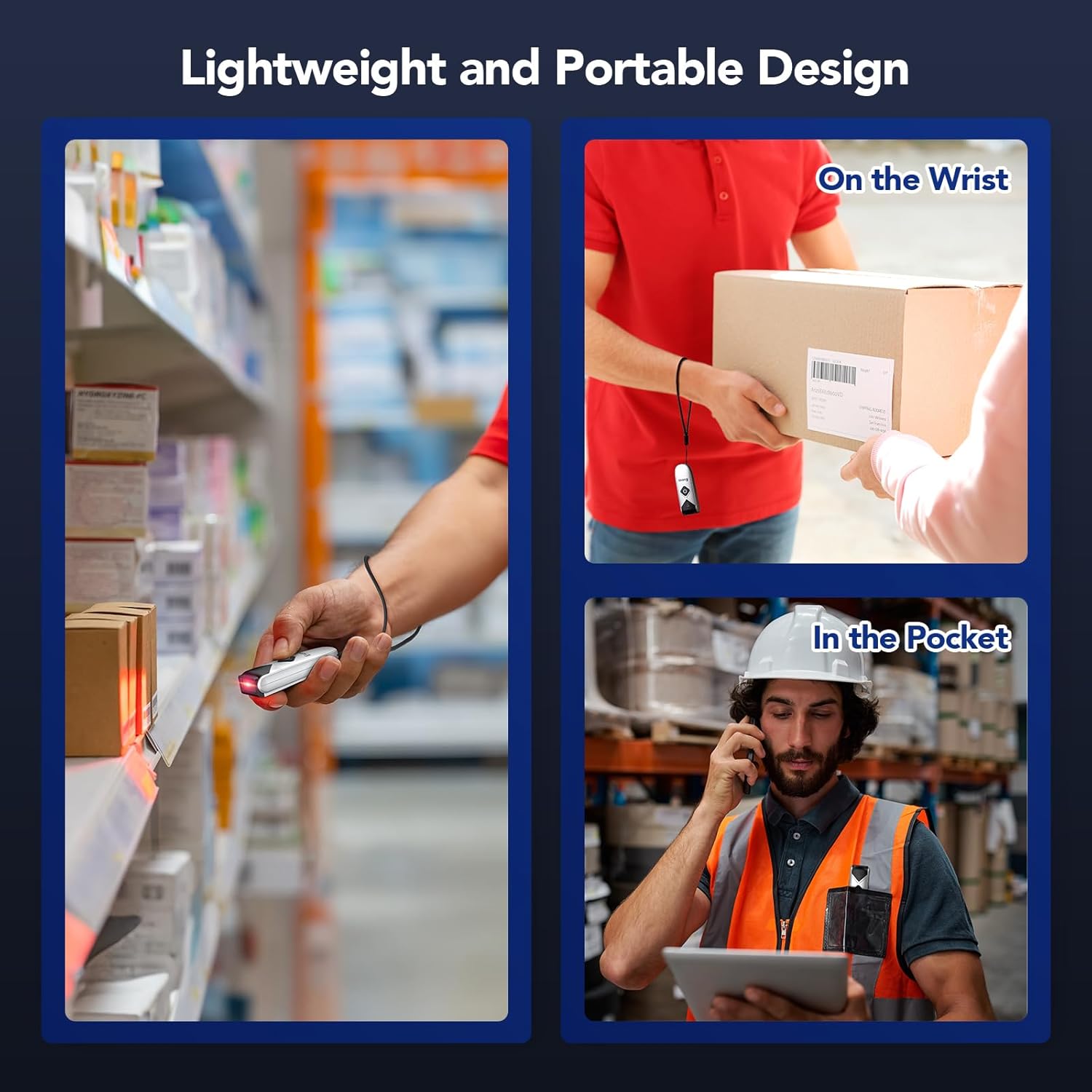 • Mini 2D Barcode Scanner: Ultra Mini Size: 3.5*1.18*0.78 inch, Ultra Lightweight: 1.5 oz. Portable and pocket size makes the wireless barcode scanner perfect for on-the-go and long-term scanning. Suitable for inventory, warehouse, supermarket, library, bookstores, library, sales stores and more