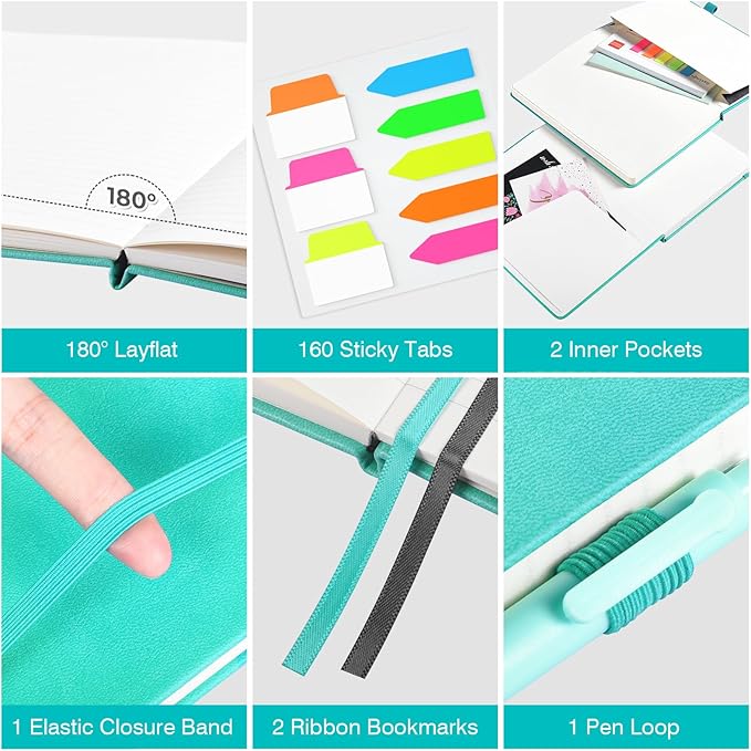 • 【Thoughtful Accessories】Our hard cover notebook comes with a range of practical accessories to enhance your writing experience. Each notebook includes 2 pockets, 2 bookmark ribbons, 1 elastic band, 1 pen loop. And as a bonus, each set of notebooks comes with 3 pens that match the color of the notebooks, along with 160 PCS colorful index & tabs stickers.
