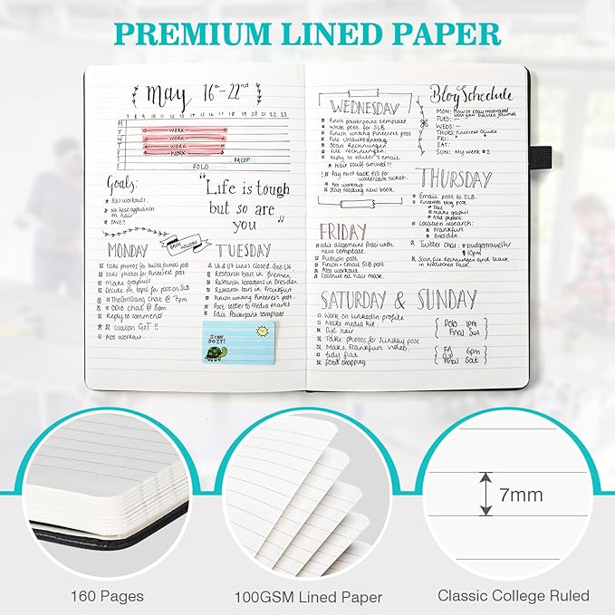 • 【Premium Writing Experience】These lined journals boast 100GSM paper with 80 sheets (160 pages). The paper is compatible with a wide range of pens, ensuring a seamless writing performance without any ink bleed-through. The 7mm line spacing is suitable for most people's writing preferences. Additionally, the pages can lay flat at 180°, allowing for easy note-taking. Ideal for school, office, outdoor activities, and travel.