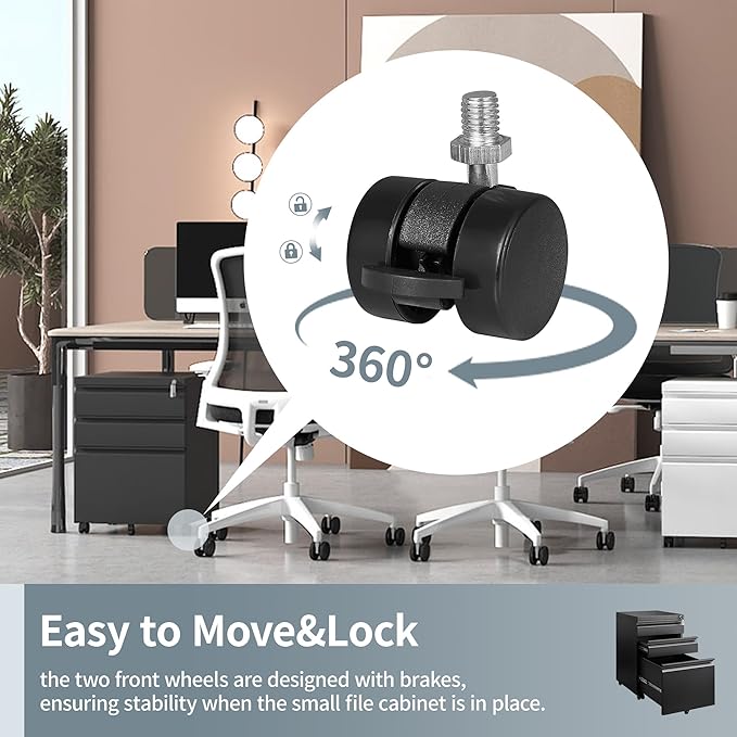 • Convenient Mobility: The file cabinets for home office is equipped with four wheels, allowing easy mobility within your office space. With the added convenience of wheels, you can effortlessly move the file cabinet with lock to different locations as needed. Additionally, the two front wheels feature brakes, ensuring stability when required. Once you have positioned the locking file cabinet, you can secure it in place to prevent any unwanted movement or potential accidents.