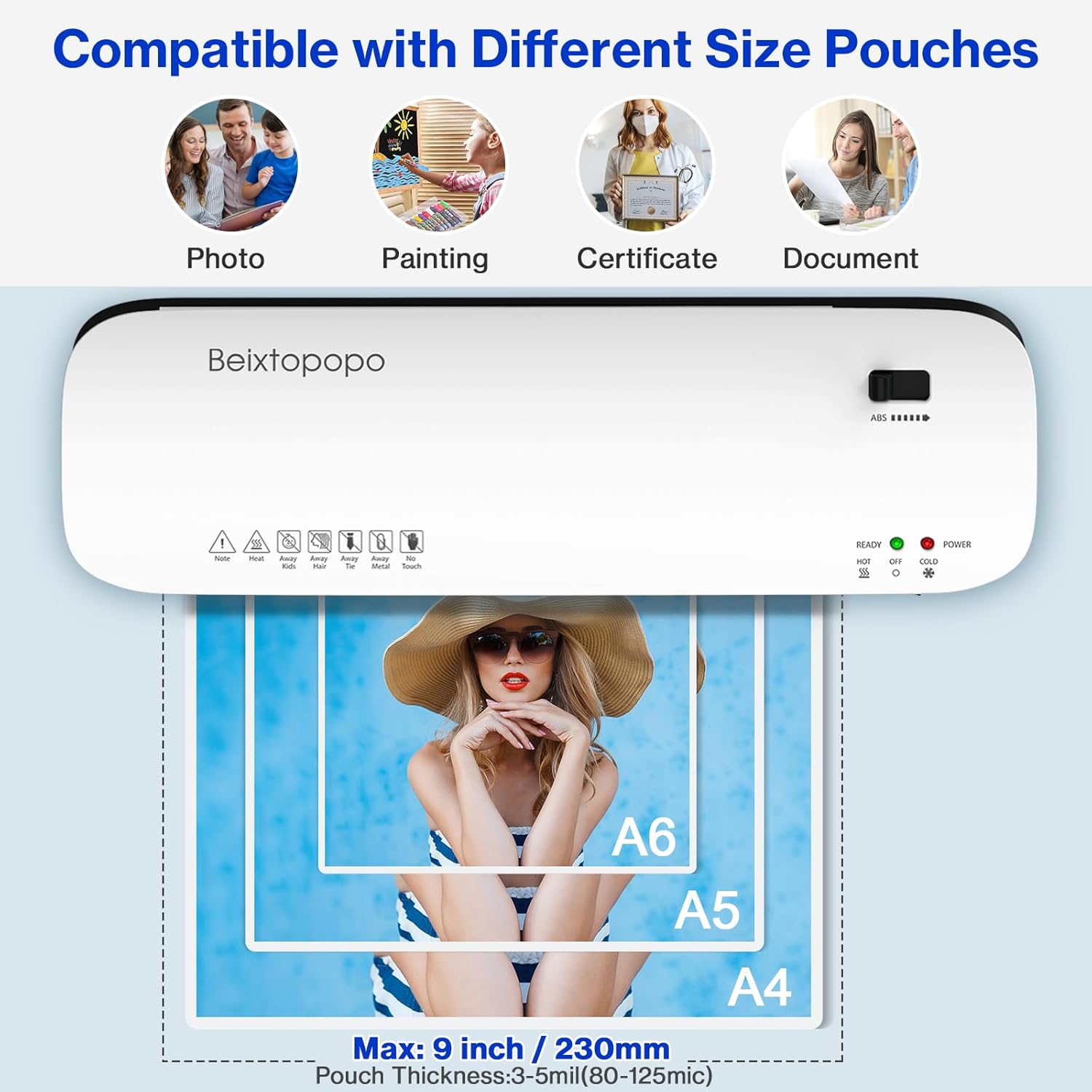 • 【Wide Lamination Application】The 8.5x11 thermal laminator machine is suitable for all A4/A5/A6 size paper,photos. It effortlessly handles popular sizes like letter size and business cards. It helps you to cherish your memory and protect your important documents from water, dirt, fading, scratches or tears. Make sure to choose pouches with a thickness of 3-4.5mil (80-100mic) for optimal lamination results.