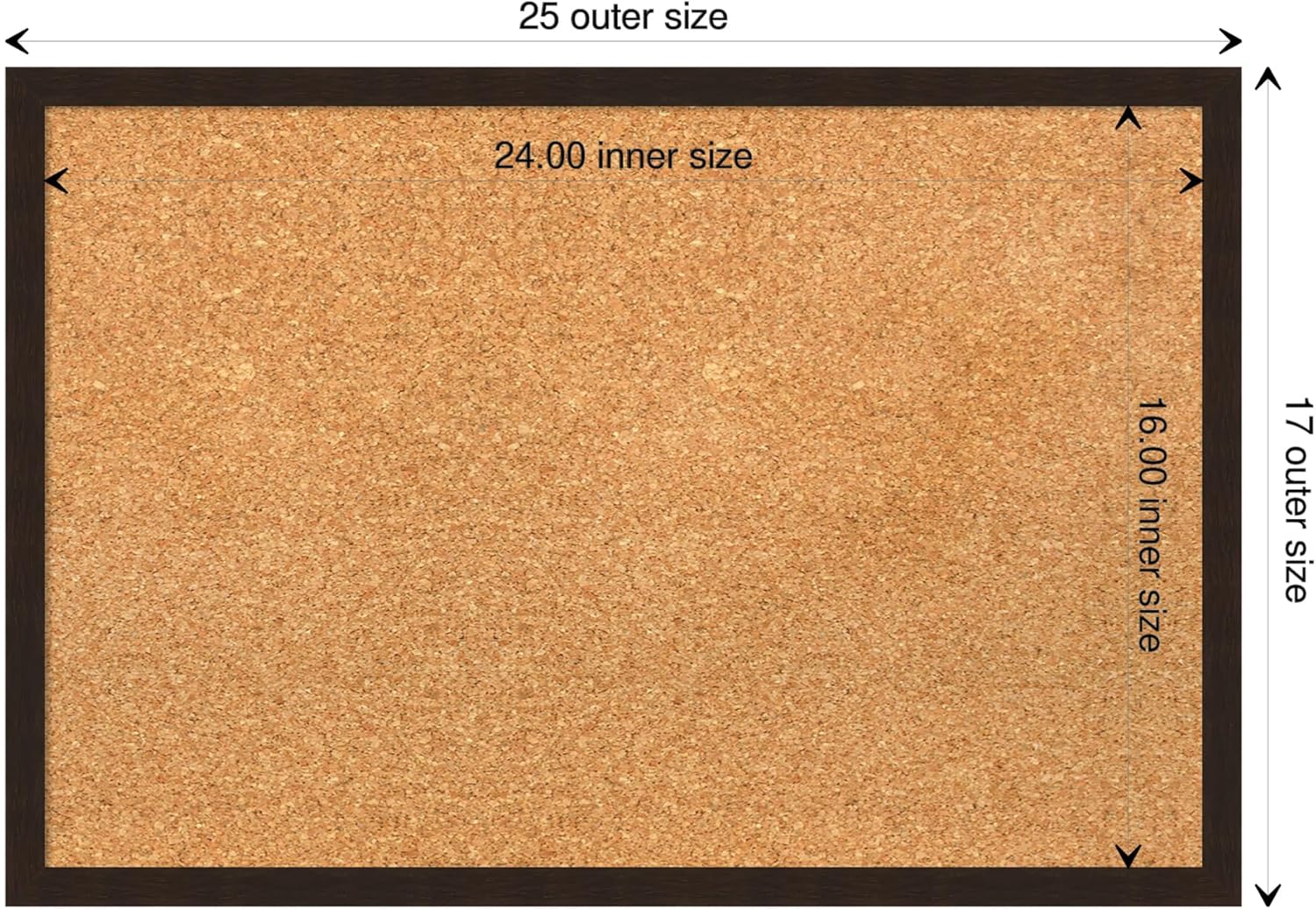 • DIMENSIONS: The overall size of this framed corkboard measures 25 in. x 17 in., including the frame. Its functional cork board area measures 24 in. x 16 in.