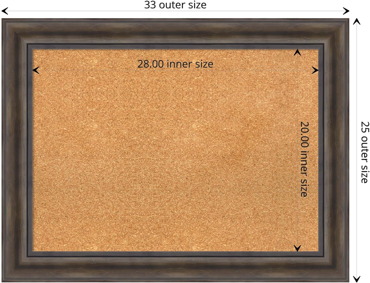 • DIMENSIONS: The overall size of this framed corkboard measures 33 in. x 25 in., including the frame. Its functional cork board area measures 28 in. x 20 in.