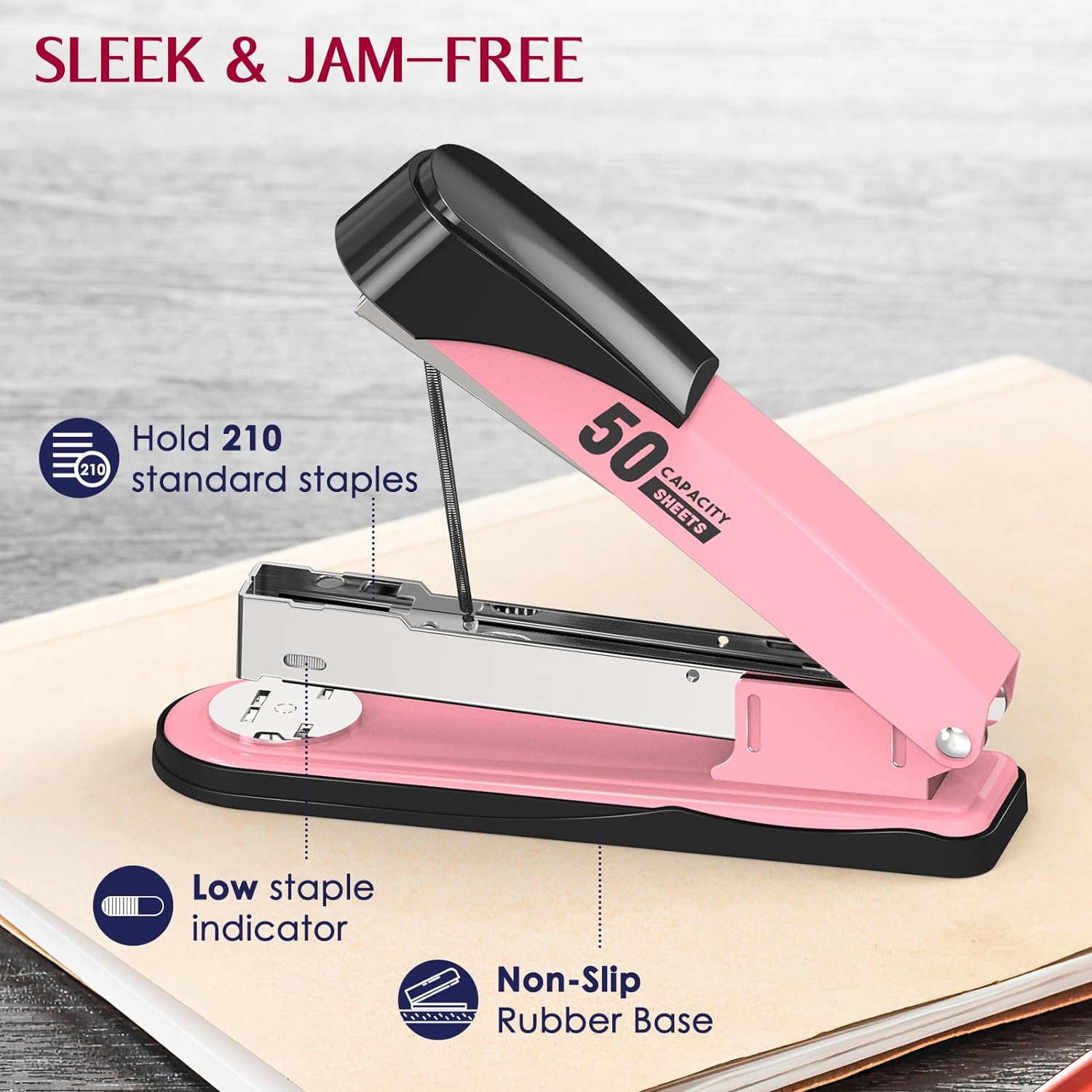 Metal Stapler Heavy Duty 50 Sheet Capacity with 1750 Staples and Staple Remover, Full Strip Staplers for Desk, No Jam, Non-Slip for Office & Classroom, Pink