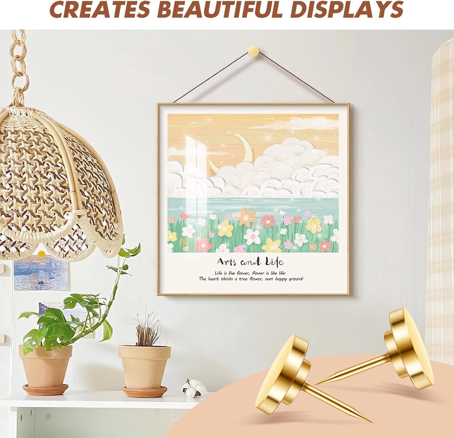 • 【Easy Installation】In the shape of ordinary push pins with gold color, these metal push pins are easy to install without causing damage to your walls. Simply tap them in with minimal effort using a picture hanging tool, and you're ready to showcase your favorite wall art or decorations, these metal push pins and picture hanging hooks are perfect for heavy-duty use.