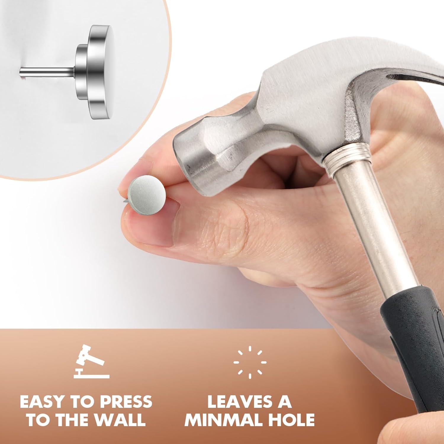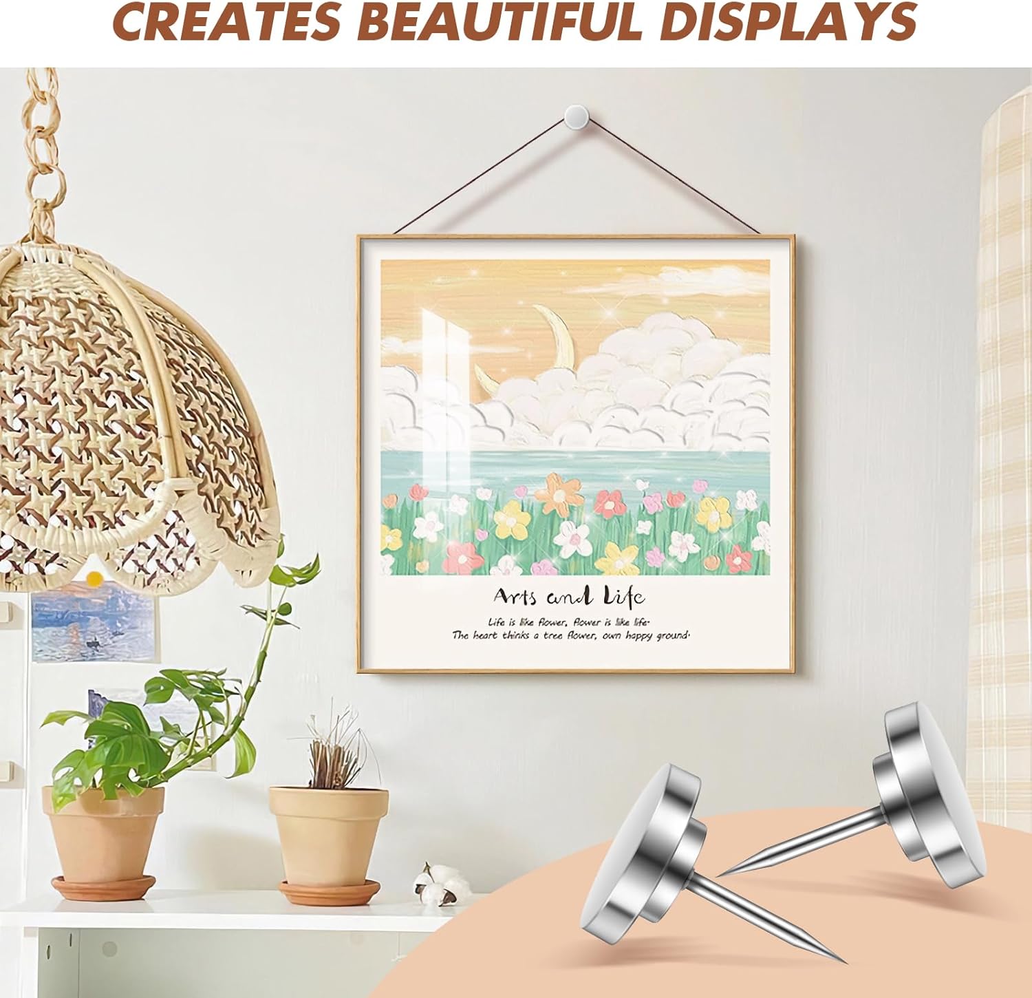 • 【Easy Installation】In the shape of ordinary push pins with silver color, these metal push pins are easy to install without causing damage to your walls. Simply tap them in with minimal effort using a picture hanging tool, and you're ready to showcase your favorite wall art or decorations, these metal push pins and picture hanging hooks are perfect for heavy-duty use.