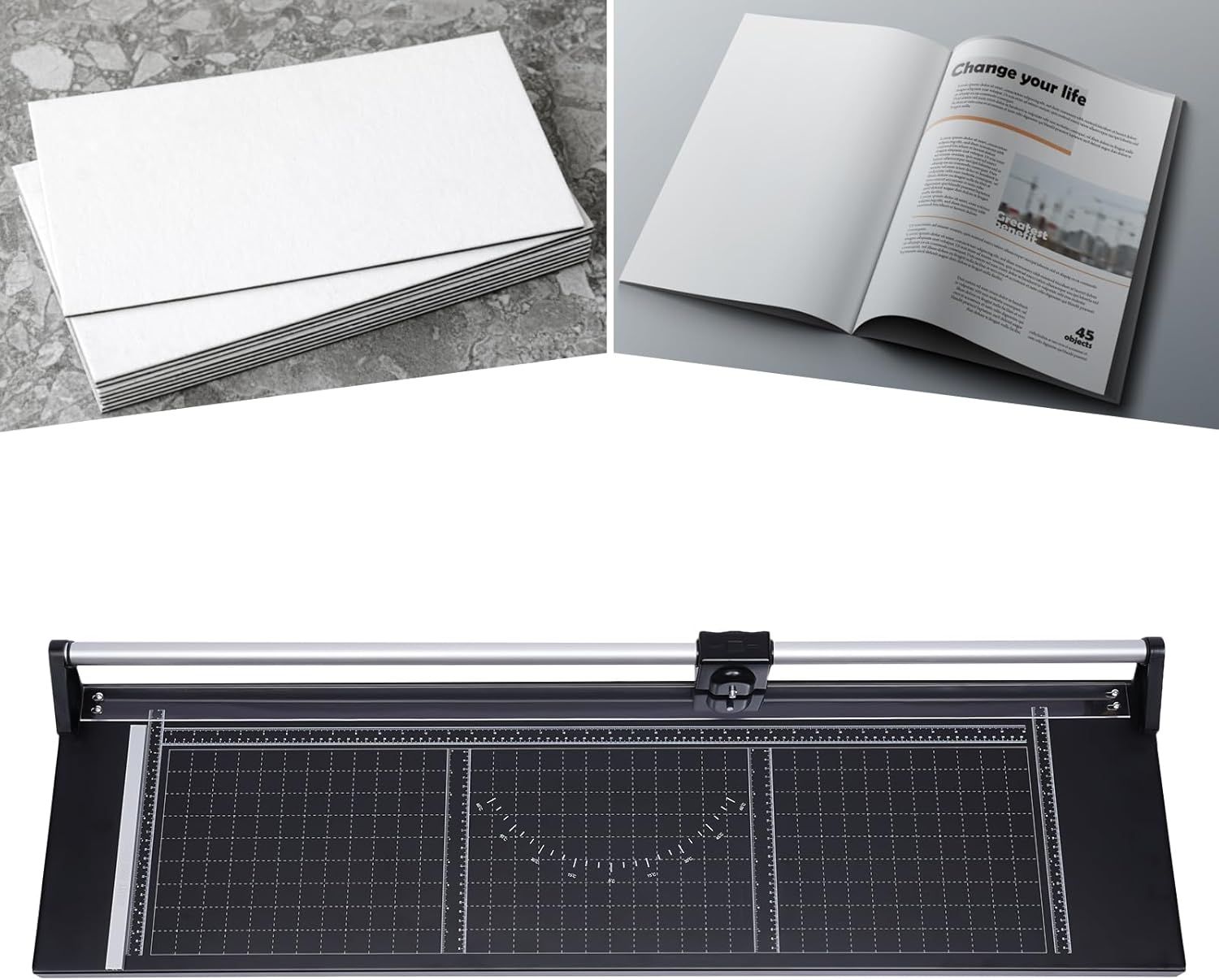 • 【Accurate Cutting】: Magnetic positioning ruler, paper pressing wheel on the blade, and paper pressing ruler ensure that the paper is flat and stable, making cutting more accurate. In addition, the clear scale in the horizontal (visible cutting length: 96.5cm/38 inches) and vertical (visible cutting width: 30.5cm/12 inches) directions also allows you to make a precise cut, and you can also use angle guidelines to cut 0°, 15°, 30°, 45°, and 60° corners.
