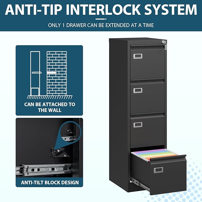 • 【File Cabinets with Lock】The top lock can secure all four drawers and protect your important paperwork, documents and books safe. To improve safe, this interlock system is also equipped with anti-tip mechanism, which is installed on each drawer side.