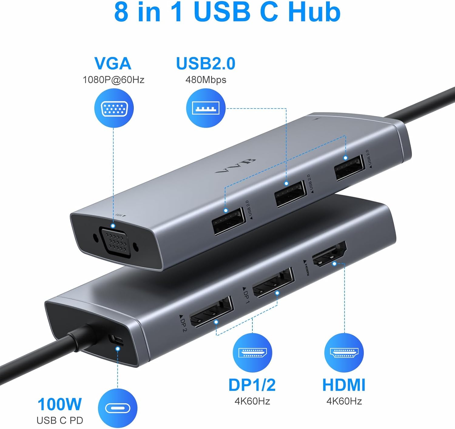 • USB C Docking Station 8 IN 1: This usb c hub can easily expand your laptop from one type c/thunderbolt 3/4 port into 8 ports: 2 DisplayPorts(4K@30Hz), HDMI(4K@60Hz), VGA(1080P@60Hz),3 USB 2.0 ports(480Mbps) and 1 USB C PD charging port(100W).No need any drivers or software, just plug and play.NOTE: This docking station compatible with laptops with a Full-featured USB C port (with vidieo out put function). And the display port usb c adapter Not Support Using Converter