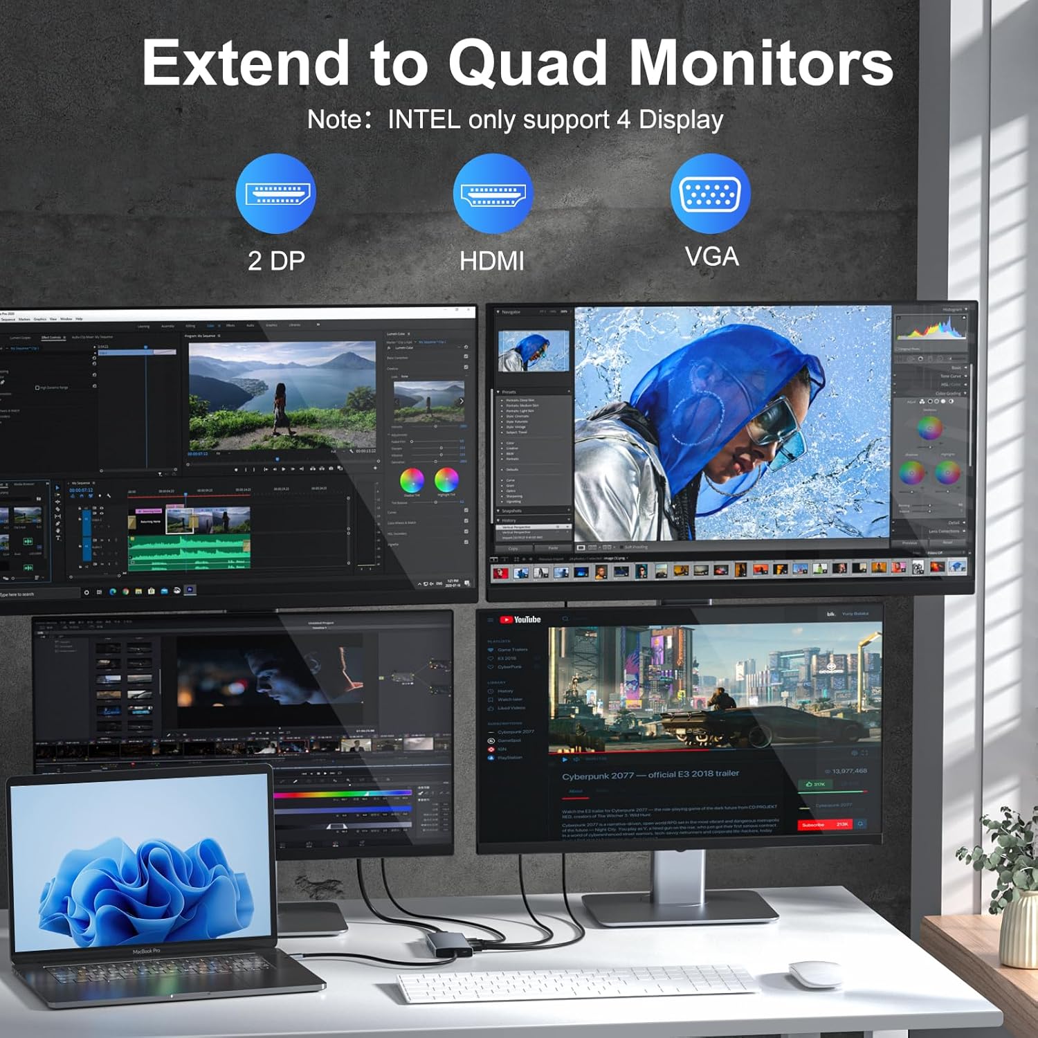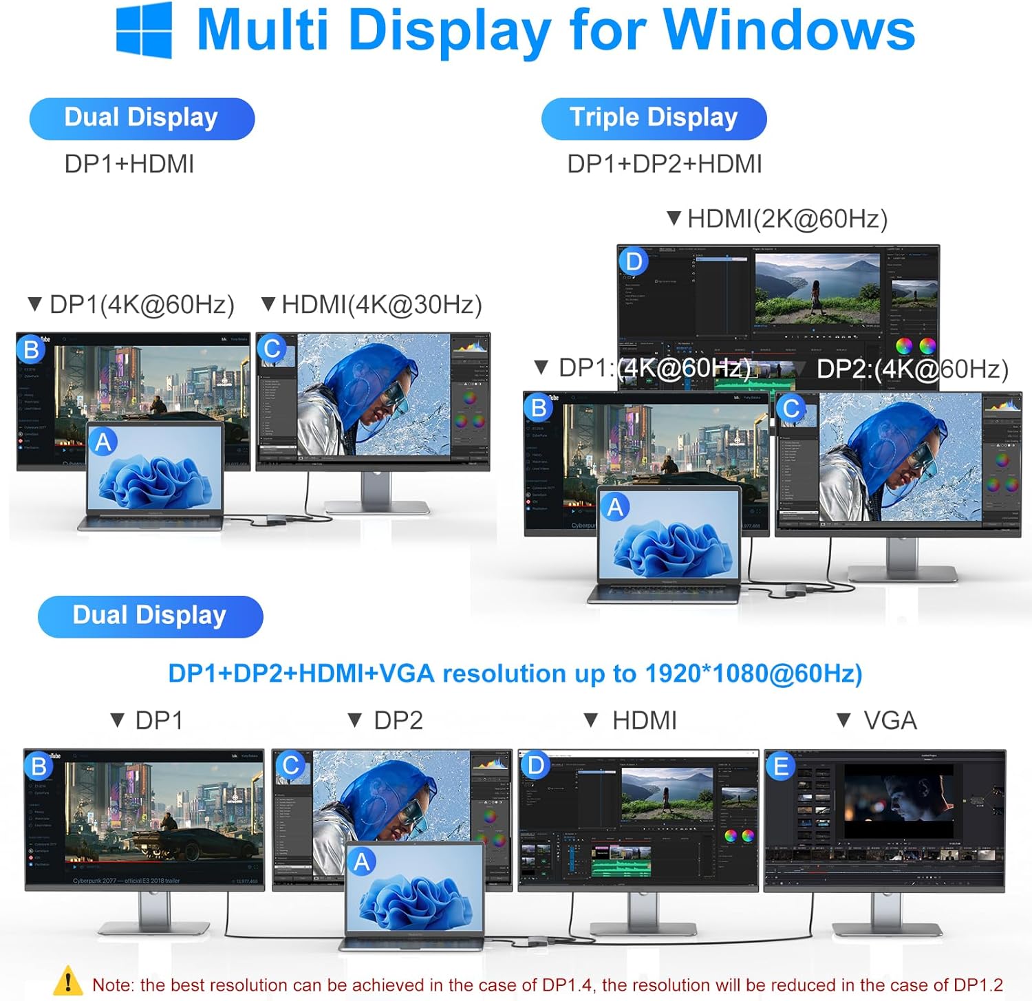 • Dual and Triple 4K Display Multiple Adapter: This docking station dual monitor can easily achieve dual monitors,triple displays and quad monitors for Windows laptop.While single use HDMI/DP1/2resolution up to 【4K@60Hz, single use VGA resolution up to 1080@60Hz. When using DP1/2+HDMI, dual monitors will be 4K@60Hz and 4K@30Hz(DP1.4); When using HDMI+DP1+DP2, triple monitors will be 2*4K@60Hz+2K@60Hz (DP1.4); Display output will be 1080P when quadruple displays and multiple monitors with VGA