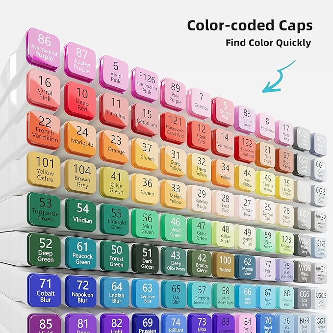 • COLOR-CODED CAPS - Organize your colors easily with our color-coded caps. They also help to keep the tips from drying out, ensuring long-lasting use. Plus, our portable carrying case with a zipper provides easy travel and storage for reuse