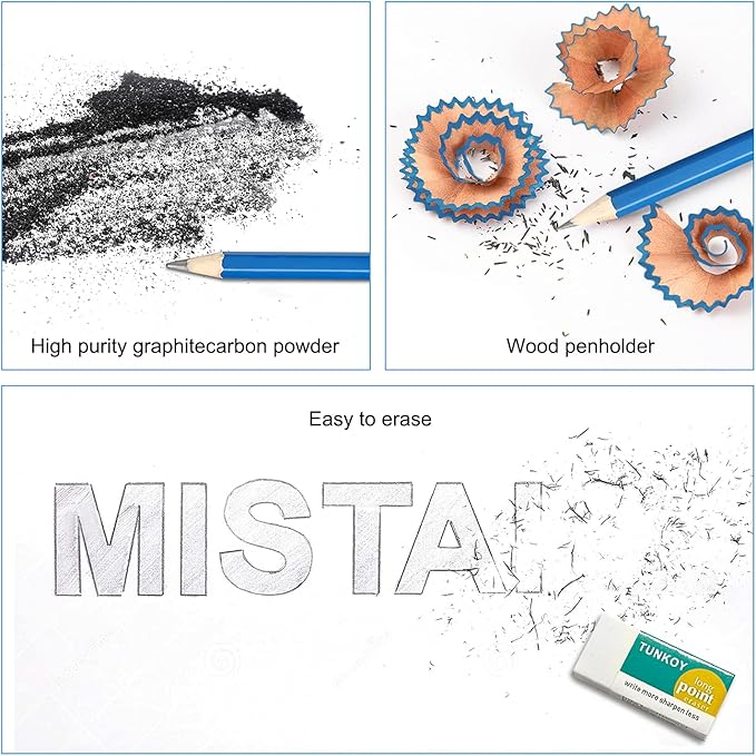 • High quality:Drawing pencil special bonding gives the graphite leads extra fracture resistance,gives them excellent permanent point strength.They are easy to sharpen and erase,Suitable for crafting fine detailed illustrations and textured shading.
