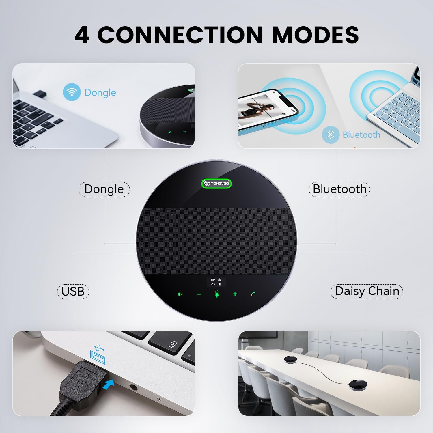 • 【Various Connection Methods & Widely Compatibility】The Wireless conference speaker can connect to various Methods, Bluetooth, USB, Wireless Dongle, and 3.5mm Jack audio and Daisy chain 5 methods connection for smartphone,PC, laptop etc. You can connect with the USB cable, Bluetooth pairing directly or go wireless with the included Dongle,No driver needed. works with Windows, Mac OS, IOS,Android, Compatible with mainstream meeting platforms such as Zoom,Teams, WebEx and more