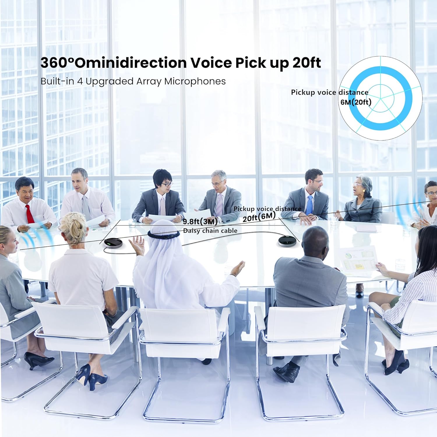 • 【Flexible Daisy Chain for Up to 30 Attendees】This Bluetooth speakerphone with flexible Daisy Chain Feature,allowing cascading 2 conference speakers to expand the effective usage range of hybrid conferences,the Conference microphone supports meetings up to 12-15 attendees, After daisy chain 2 computer speakers to achieve a wider scope of voice pickup 40ft (12M) by using 9.8ft daisy chain cable,enabling up to 30 participants to hear clearer and louder voice in 30-60㎡ large conference rooms