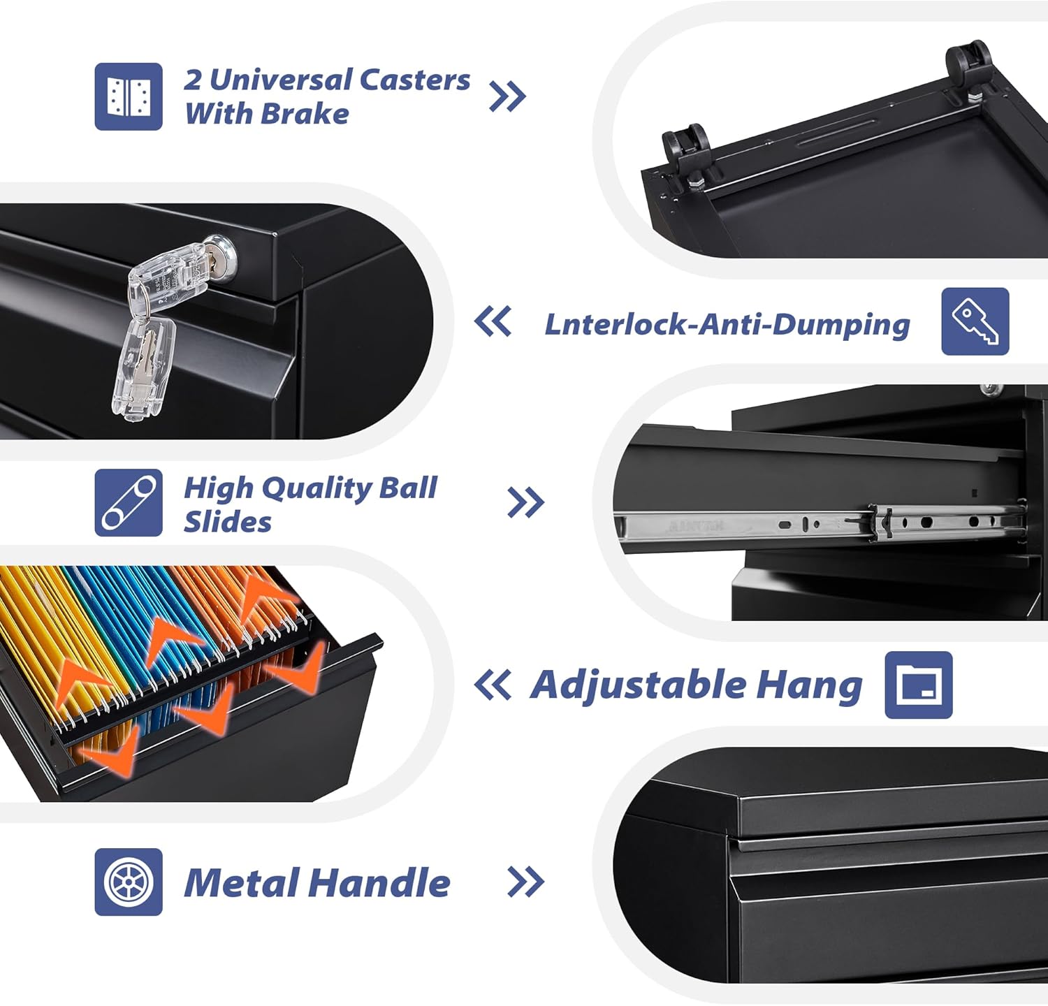 • 【Interlocking System】:The anti-tilt device allows only one drawer to be opened at a time, preventing the filing cabinet from tipping forward. Furthermore, our under desk filing cabinet is equipped with a central lock, which can secure all drawers with just one key, adding an extra layer of security to your home or office.