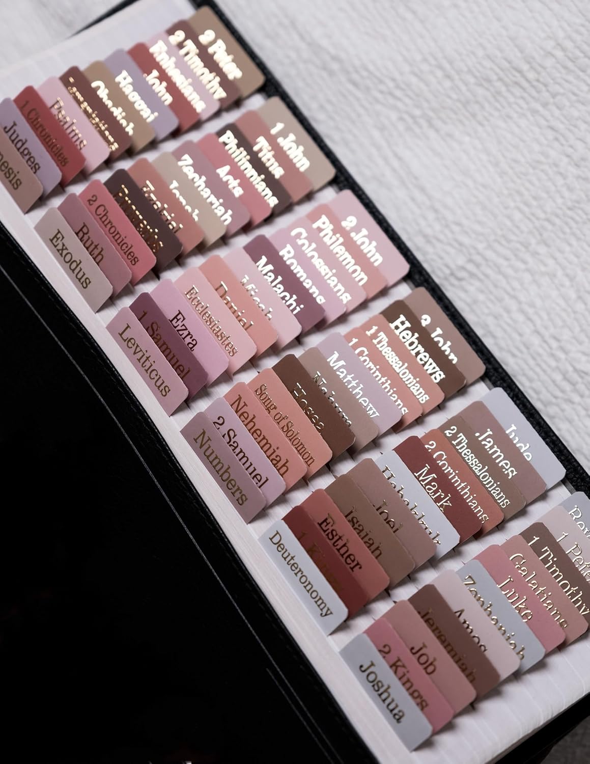 • Large Print, Easy to Read & Easy to Install: Silky velvet touch laminate,carefully designed pretty Bible accessories . The peel-and-stick Bible index tabs are self adhesive, simply align them with the provided guide or place them creatively.