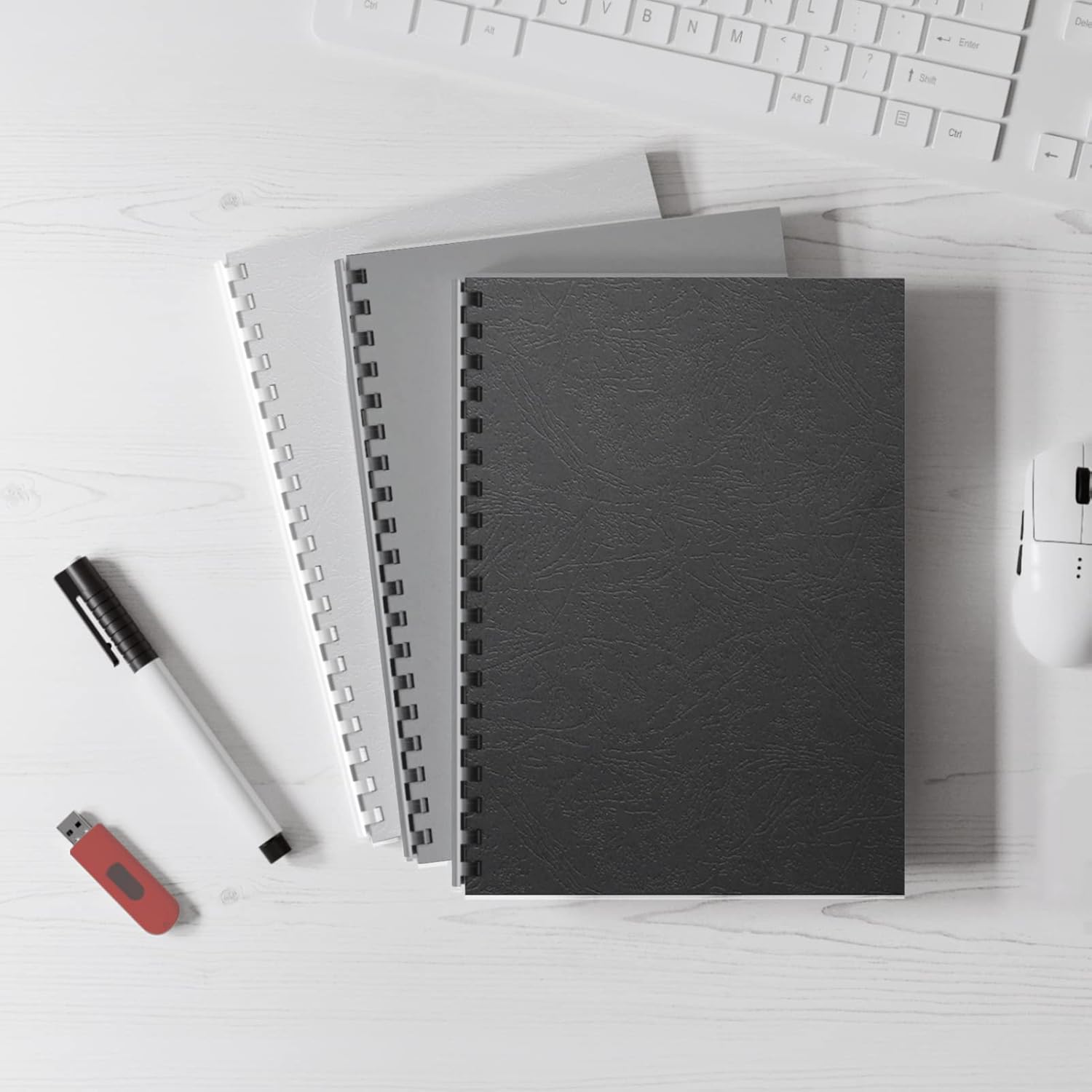• Sand & Leather Textured: Plastic binding back covers are designed with a leather-texture on one side, and a sand-texture on the reverse. (Attention: leather-like appear, not made from leather)
