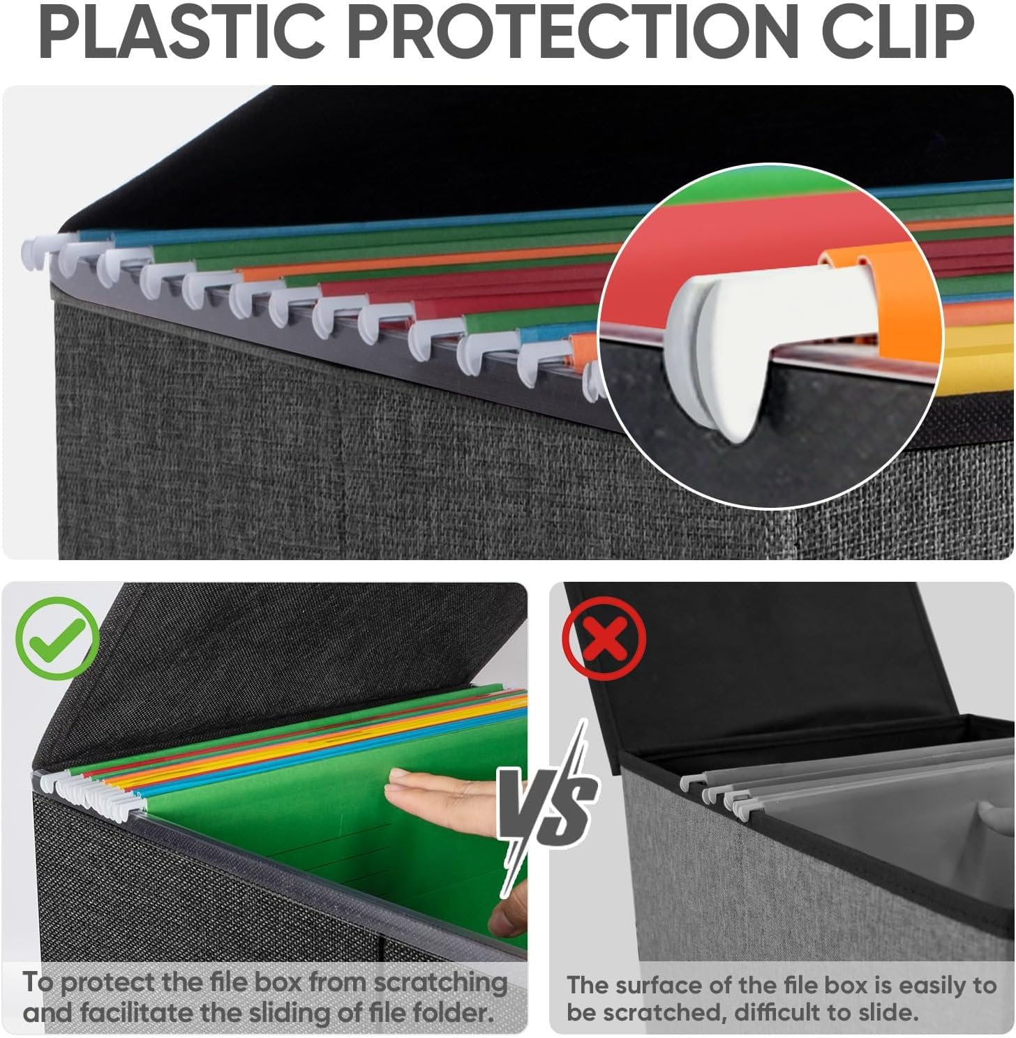 • [UNIVERSAL SIZE] Our file box with lid fits letter-sized files. It is designed for efficiency and functionality, with its smooth PVC slide rails on both sides, you can effortlessly slide file folders for easy access and neatly arranged. The lid fits snugly on the box after hanging folders. (NOTE: file folders are not included)