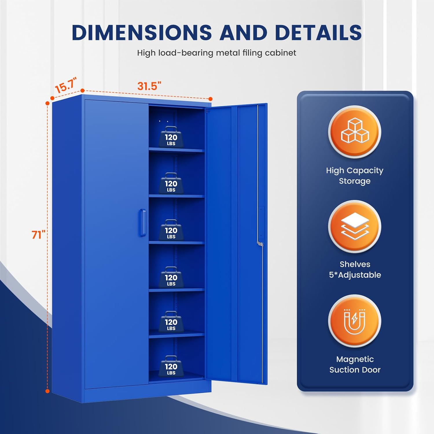 Yizosh Metal Garage Storage Cabinet with 2 Doors and 5 Adjustable Shelves - 71" Steel Lockable File Cabinet,Locking Tool Cabinets for Office,Home,Garage,Gym,School (Blue)